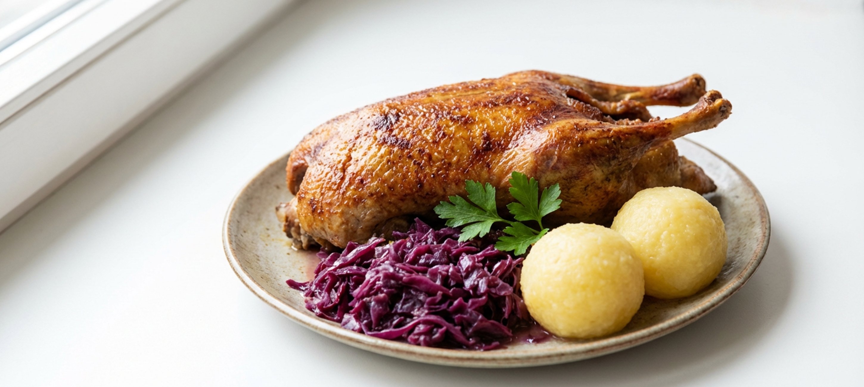 - 7Die Ente portionieren und mit dem Rotkraut, den Knödeln und dem Natursaft servieren.