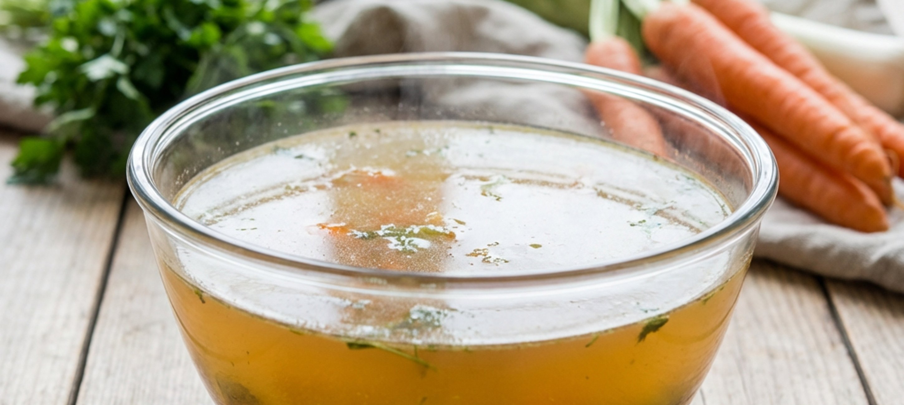 - 5Glatte Petersilie, Thymian, Salz und die Gewürze (Piment, Pfefferkörner, Lorbeerblatt) hinzufügen. Die Hitze auf ein Minimum reduzieren und den Fond ohne Deckel ca. 45 Minuten sanft köcheln lassen. Wichtig: Nicht umrühren!