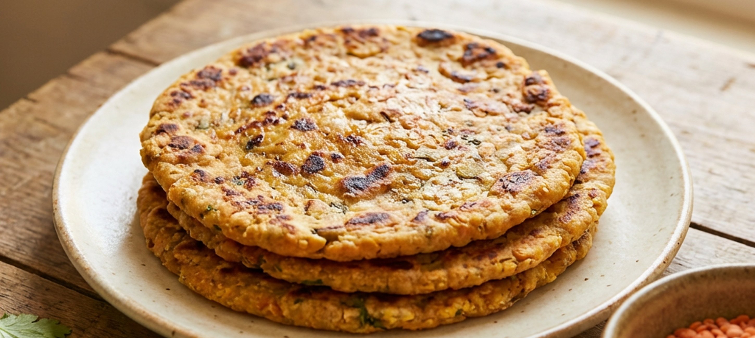 - 3Eine mittelgroße, beschichtete Pfanne (ca. 20 cm Durchmesser) ohne Fett bei mittlerer Hitze vorwärmen. Die Hitze auf niedrige bis mittlere Stufe reduzieren. Nacheinander 4 Fladenbrote aus dem Teig backen: Dazu jeweils ein Viertel des Teigs in die Pfanne gießen und von jeder Seite ca. 2–3 Minuten goldbraun braten.