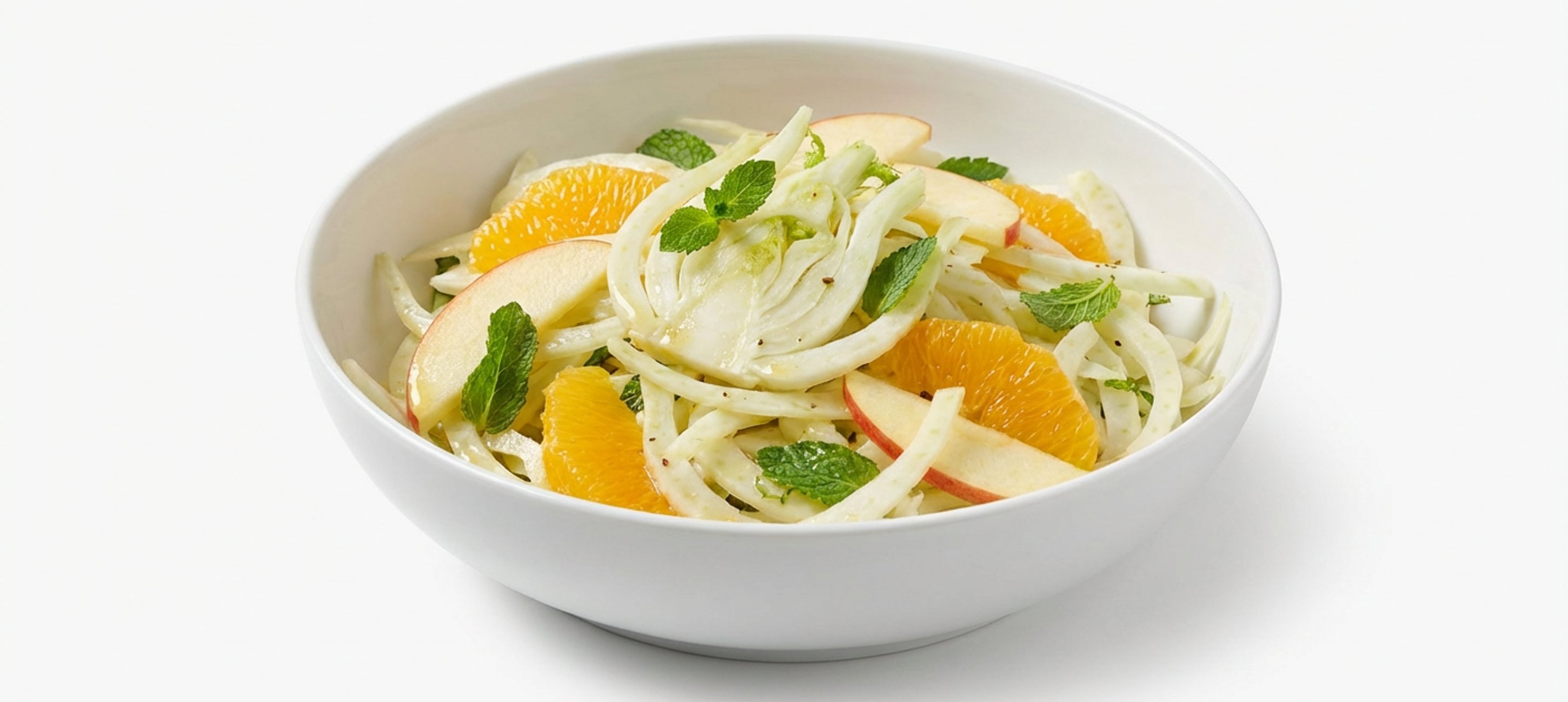 - 4In einer großen Salatschüssel alle vorbereiteten Zutaten vorsichtig vermengen. Mit Olivenöl, Zitronensaft, Zucker, Salz und frisch gemahlenem Pfeffer abschmecken. Mit der frisch geschnittenen Minze und dem beiseitegelegten Fenchelgrün garnieren.
