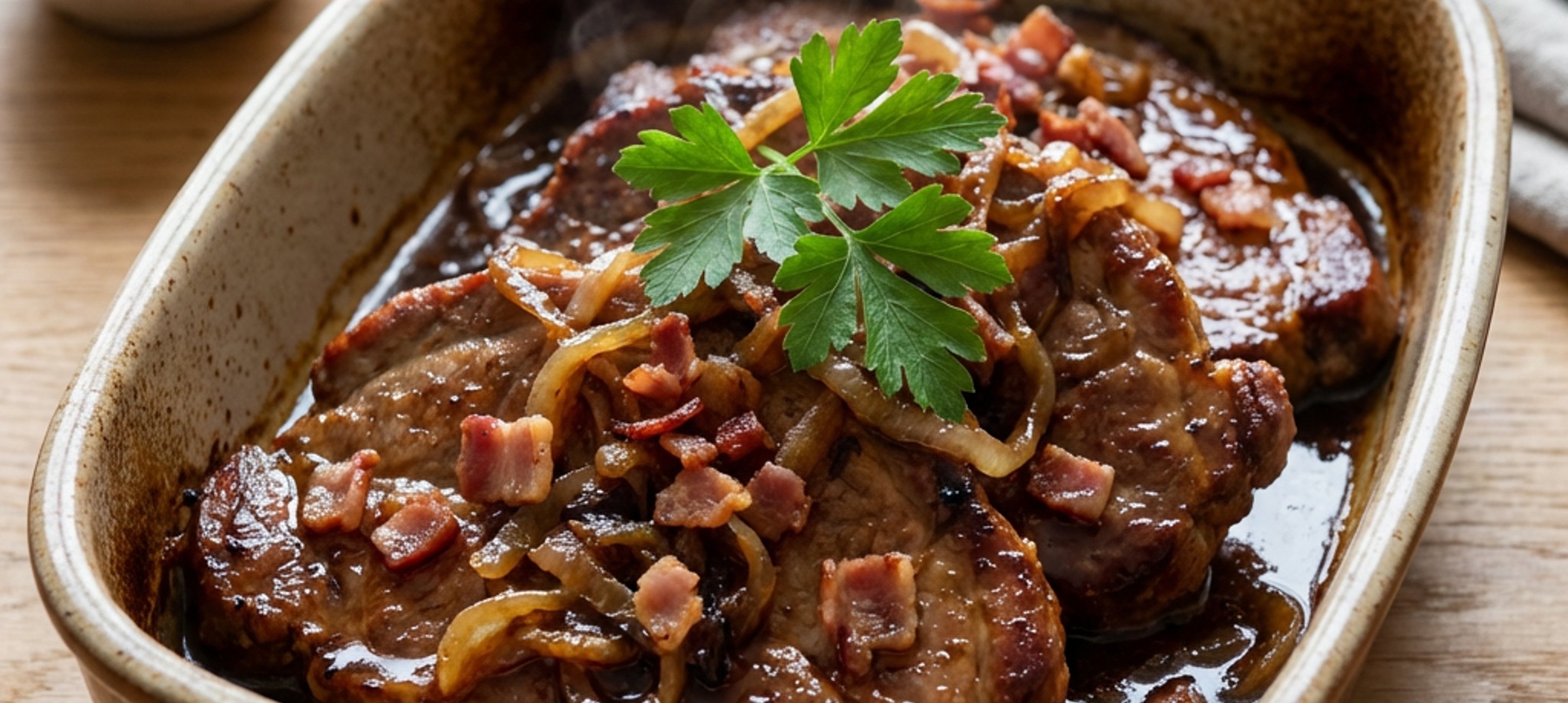 - 2Das Fleisch von beiden Seiten kräftig mit Salz und Pfeffer würzen. Die Zwiebeln schälen und in etwa 1 cm dicke Spalten schneiden. Den Bauchspeck in kleine Würfel oder Streifen schneiden.