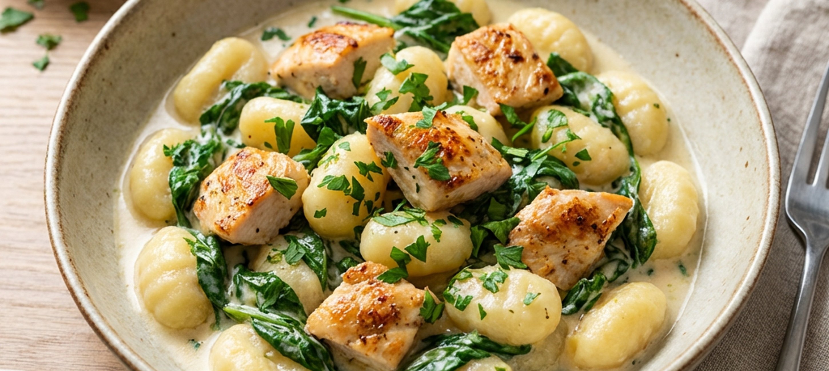 - 1Die Hendlbrust in mundgerechte Streifen schneiden. Zwiebel und Knoblauch fein würfeln. Den Blattspinat waschen und gut abtropfen lassen.