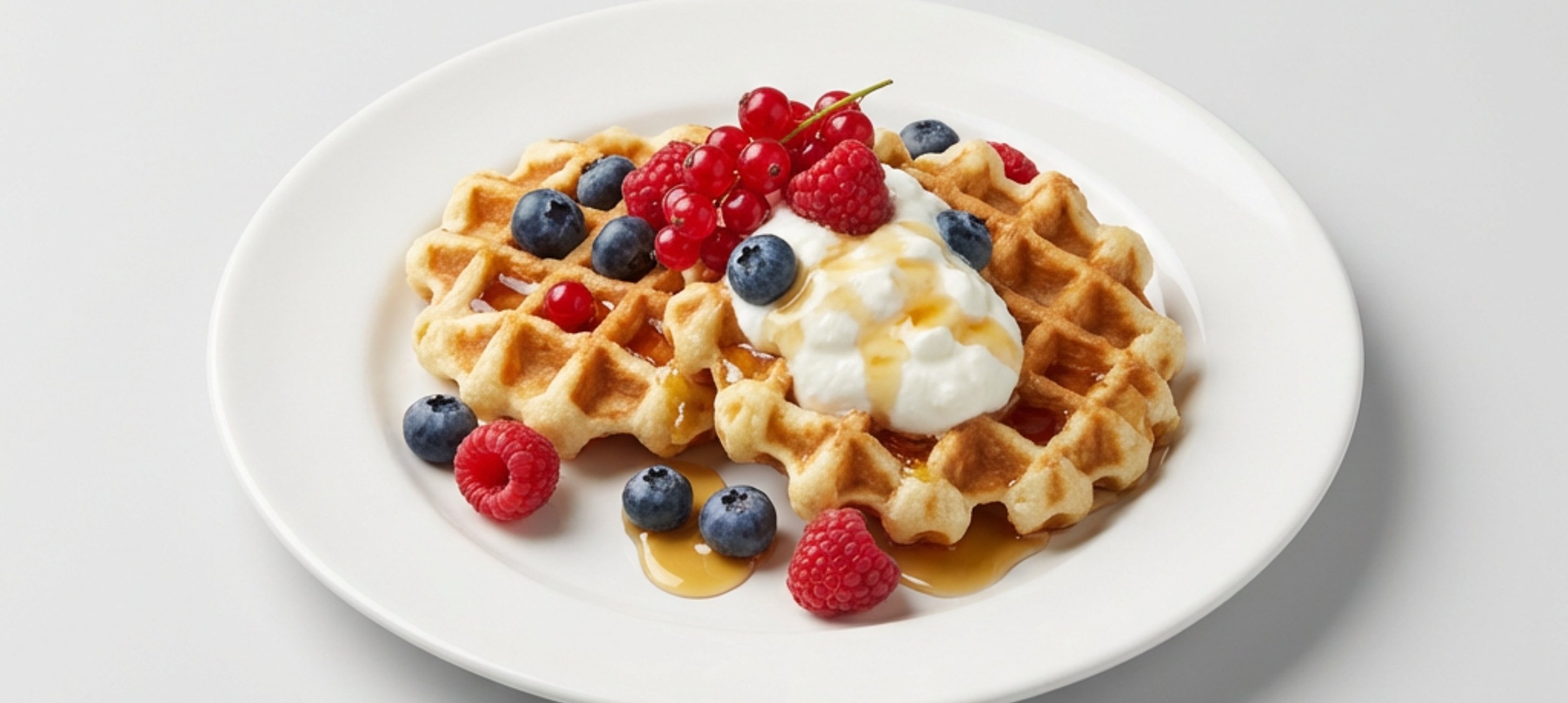 - 3Die fertigen Waffeln mit frischen Beeren (Heidelbeeren, Himbeeren, Ribisel), einem Klecks Magertopfen oder Naturjoghurt anrichten und mit Ahornsirup beträufelt servieren.