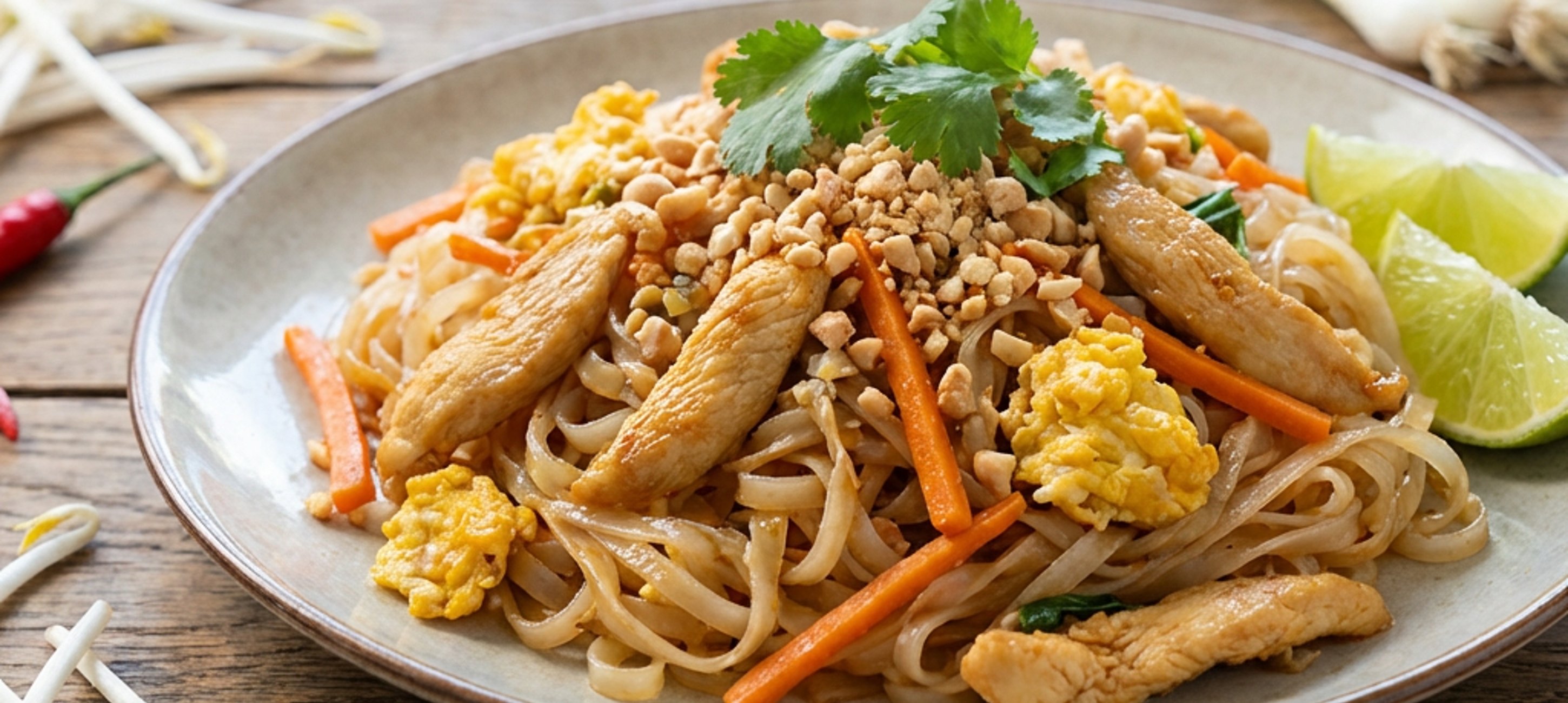- 7Das fertige Pad Thai auf drei Tellern anrichten. Die gerösteten Erdnüsse grob hacken und über jede Portion streuen. Mit frischem Koriander garnieren und mit Limettenspalten servieren.