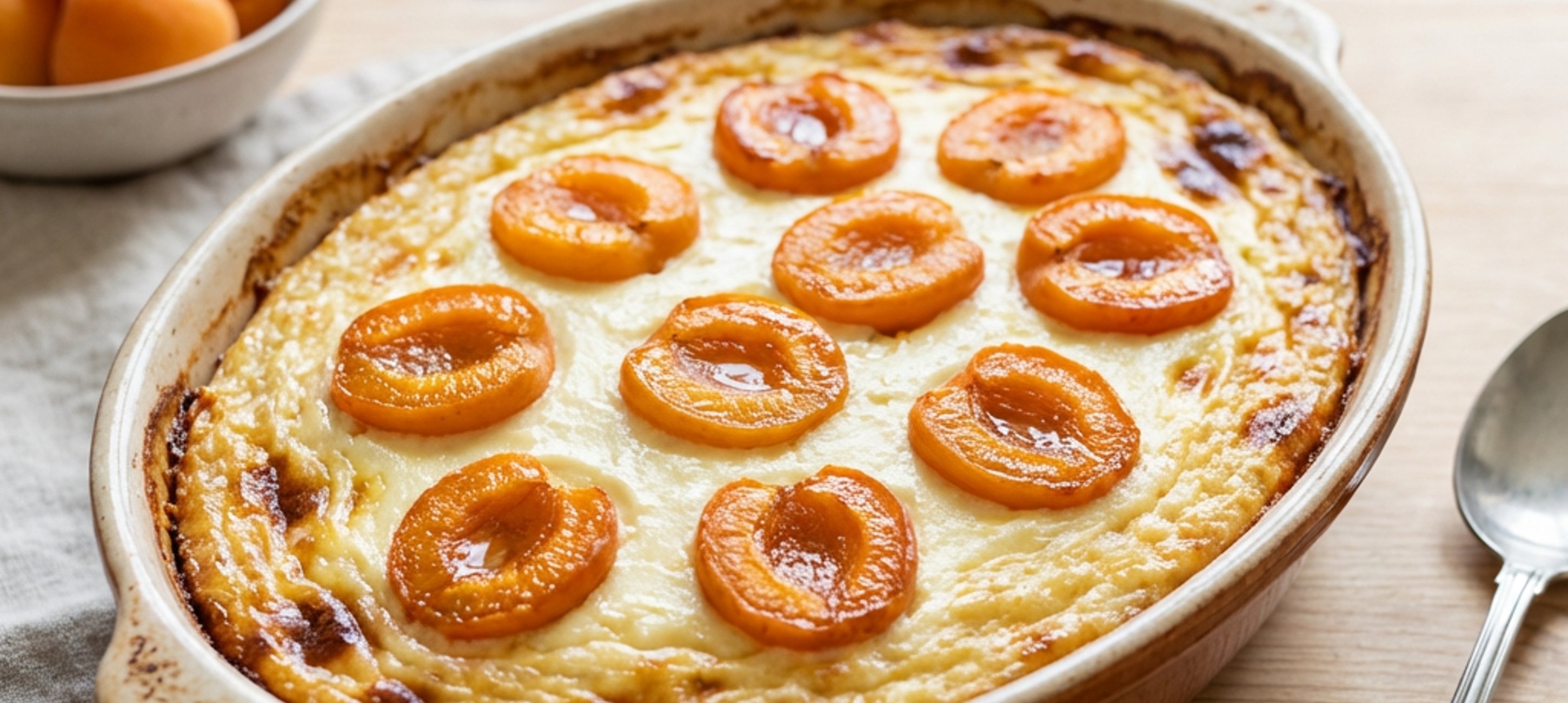 - 5Eine Auflaufform mit Butter einfetten und mit Semmelbröseln ausstreuen. Die Reismasse in die Form füllen und glatt streichen. Die Topfenfüllung gleichmäßig darauf verteilen und mit den Marillenhälften belegen.