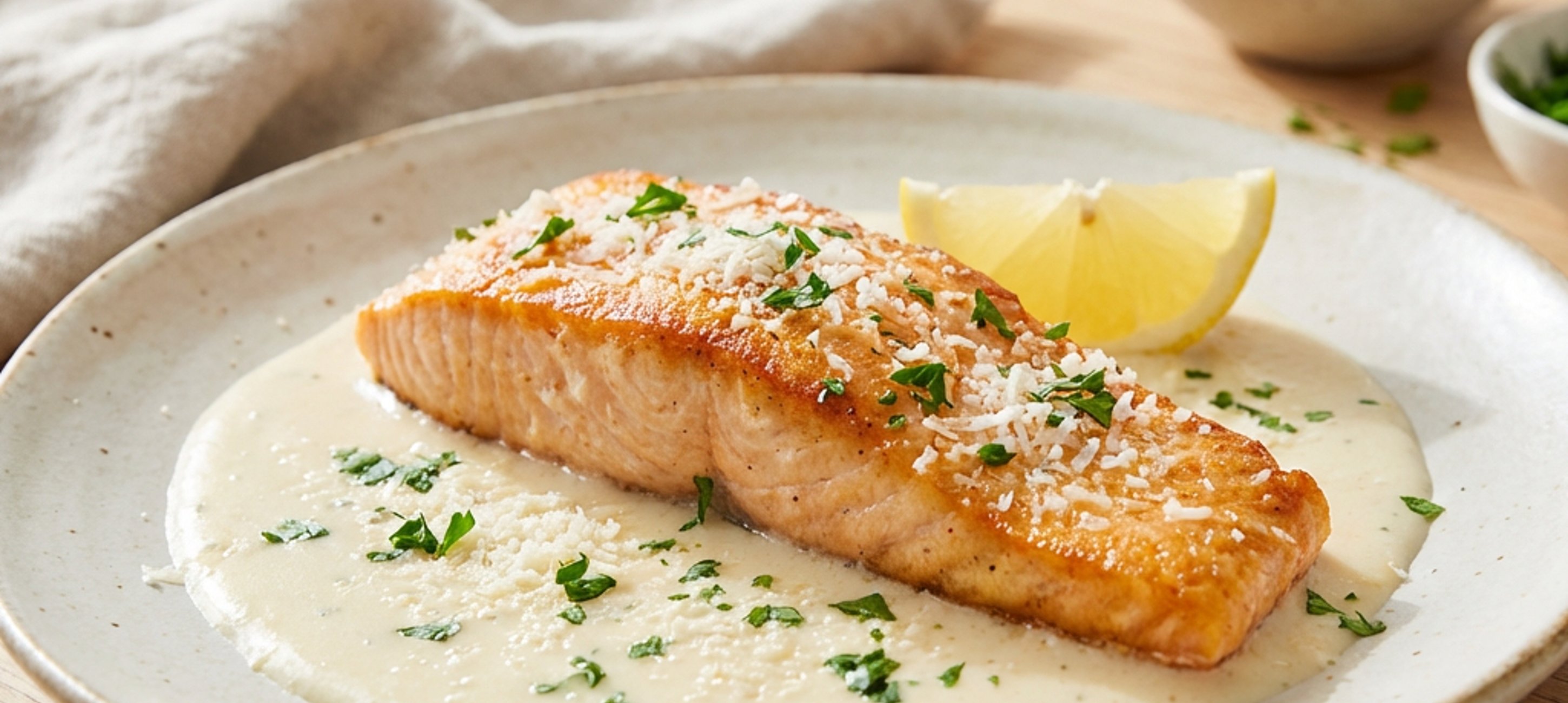 - 5Nach dem Abkühlen 400 ml Schlagobers und die fein gehackte Petersilie in die Pfanne rühren. Nach Bedarf mit Salz, Pfeffer und Zitronensaft abschmecken. Zum Schluss die angebratenen Lachsfilets zurück in die Pfanne geben und alles bei mittlerer Hitze nochmals 1–2 Minuten köcheln lassen.