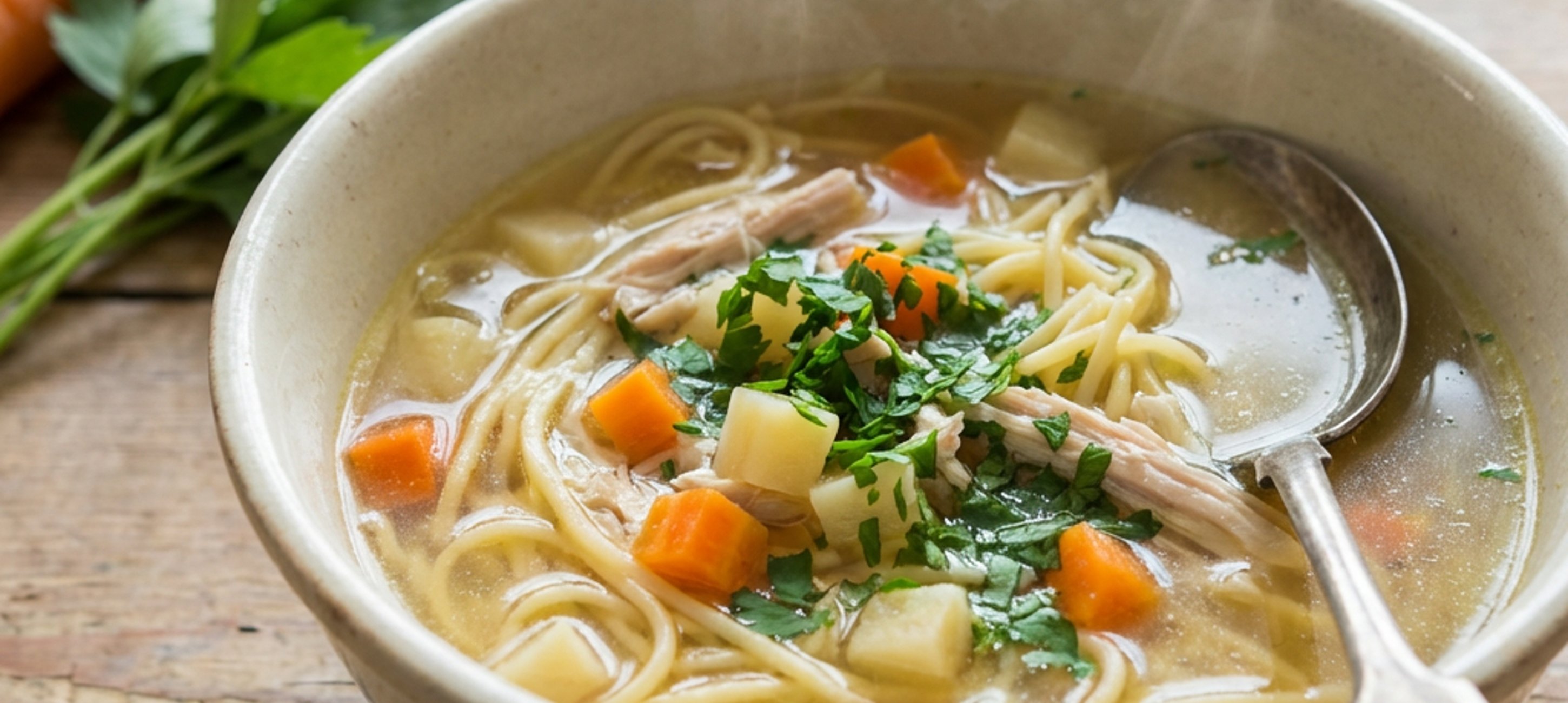 - 5Zum Servieren die Nudeln in tiefe Teller geben, mit der heißen Hühnersuppe aufgießen und großzügig mit frisch gehackter Petersilie bestreuen.