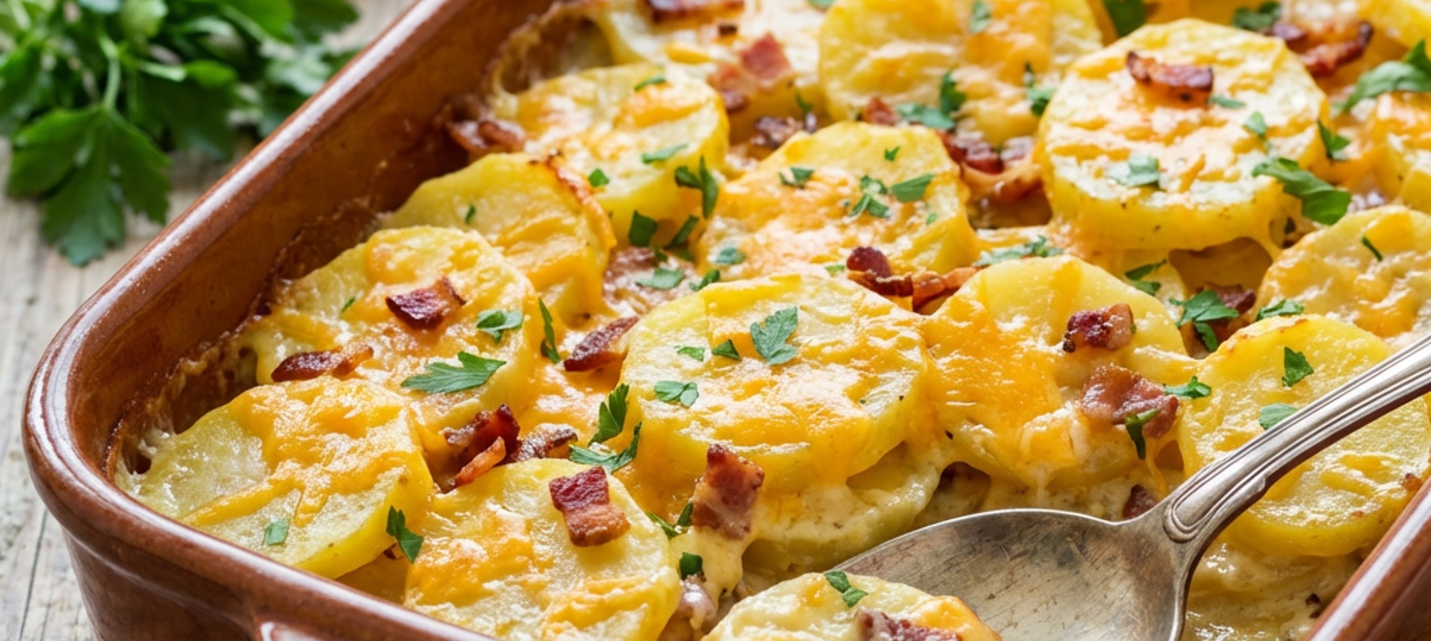 - 4Die Erdäpfelscheiben mit einem Schaumlöffel in die Auflaufform schichten. Dabei darauf achten, dass etwa 200 ml der Obers-Milch-Mischung im Topf zurückbleiben. Den geriebenen Gouda und Cheddar in die restliche Flüssigkeit geben und bei geringer Hitze 1–2 Minuten schmelzen lassen. Mit Salz und Pfeffer abschmecken, vom Herd nehmen und die gehackte Petersilie unterrühren. Die Käsesauce gleichmäßig über die Erdäpfel gießen.