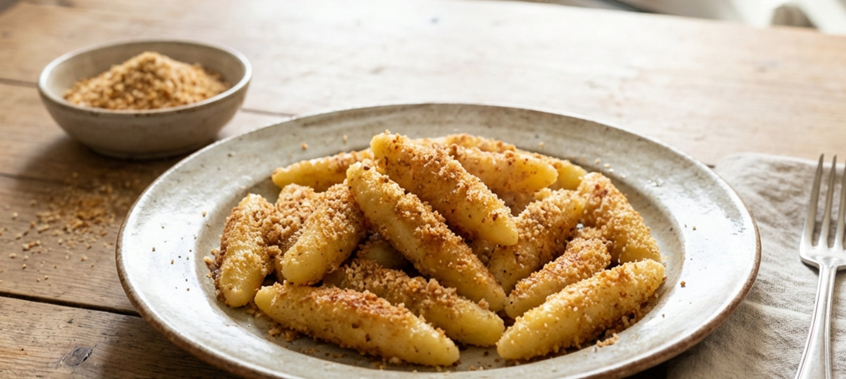 - 6Die Erdäpfelwuzerl in einer Pfanne mit dem restlichen Schmalz rundherum goldgelb anbraten. Die heißen Wuzerl sofort in den gerösteten Bröseln wälzen, bis sie gleichmäßig bedeckt sind. Nach Belieben mit Staubzucker bestreuen oder als herzhafte Beilage servieren.