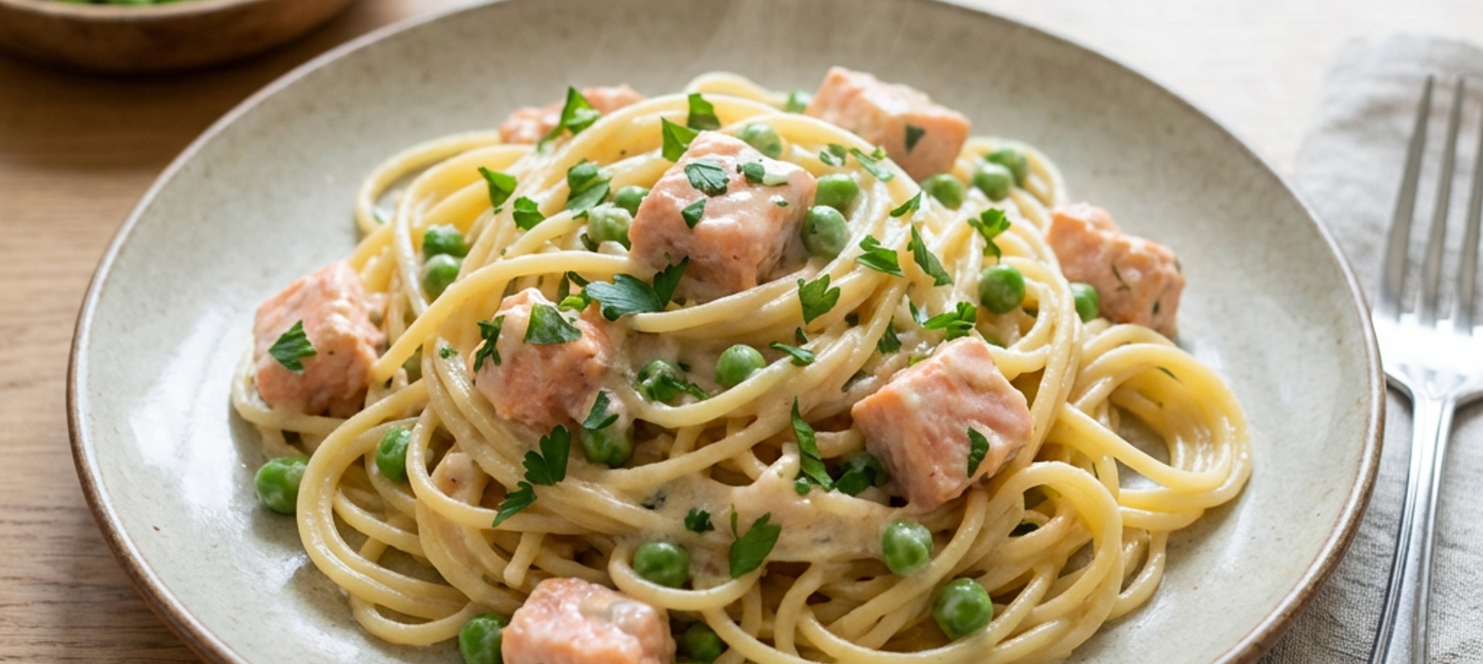 - 4Nach dem Anbraten Wasser und Sahne dazugeben, den Frischkäse einrühren und die Sauce 4–5 Minuten köcheln lassen, bis sie eindickt. Zum Schluss die Erbsen, Petersilie und die gekochte Pasta in die Pfanne geben, alles gut vermengen, die Hitze ausschalten und servieren.