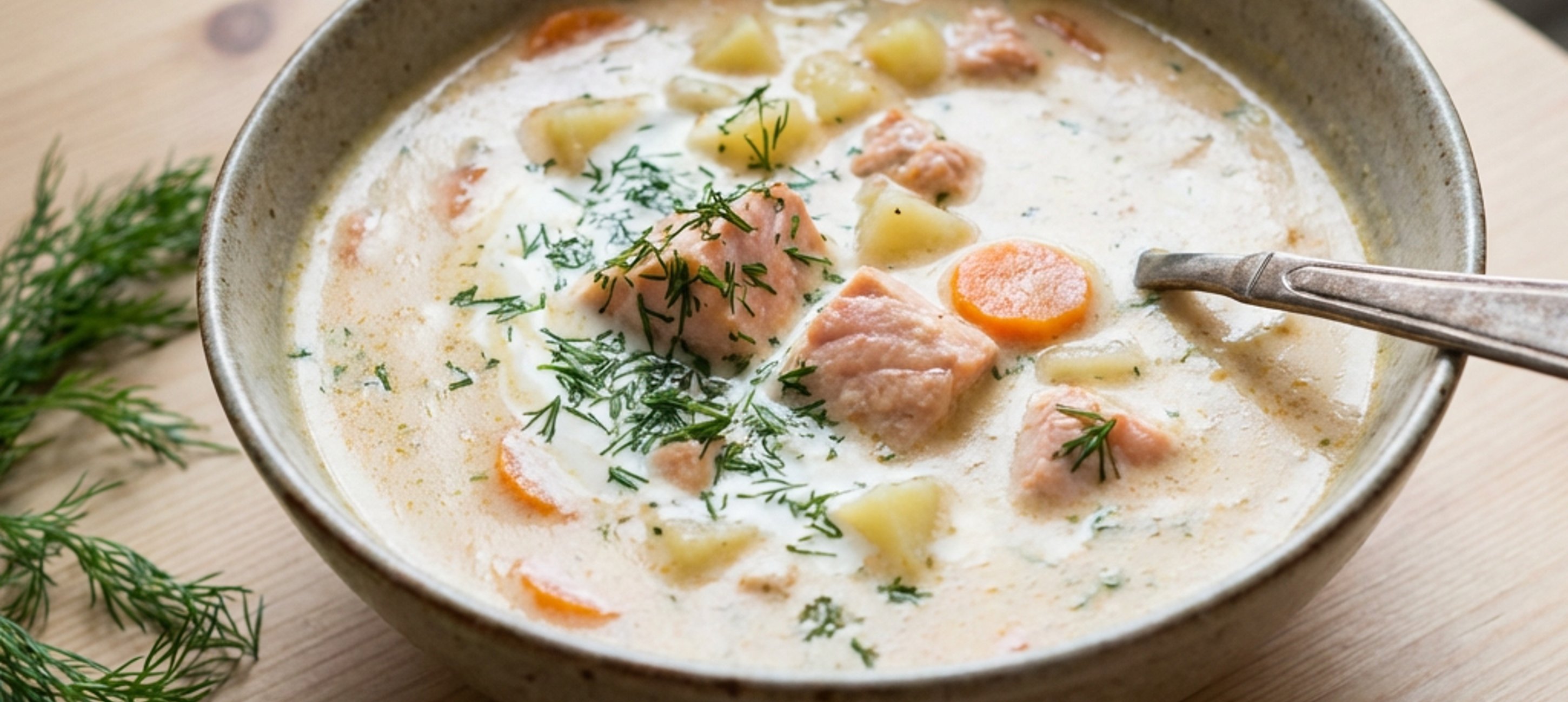 - 4Sobald das Gemüse gar ist, das Schlagobers, die Lachswürfel und die gehackte Dille in den Topf geben. Alles für weitere 3–4 Minuten bei mittlerer Hitze ziehen lassen, bis der Lachs gar ist.