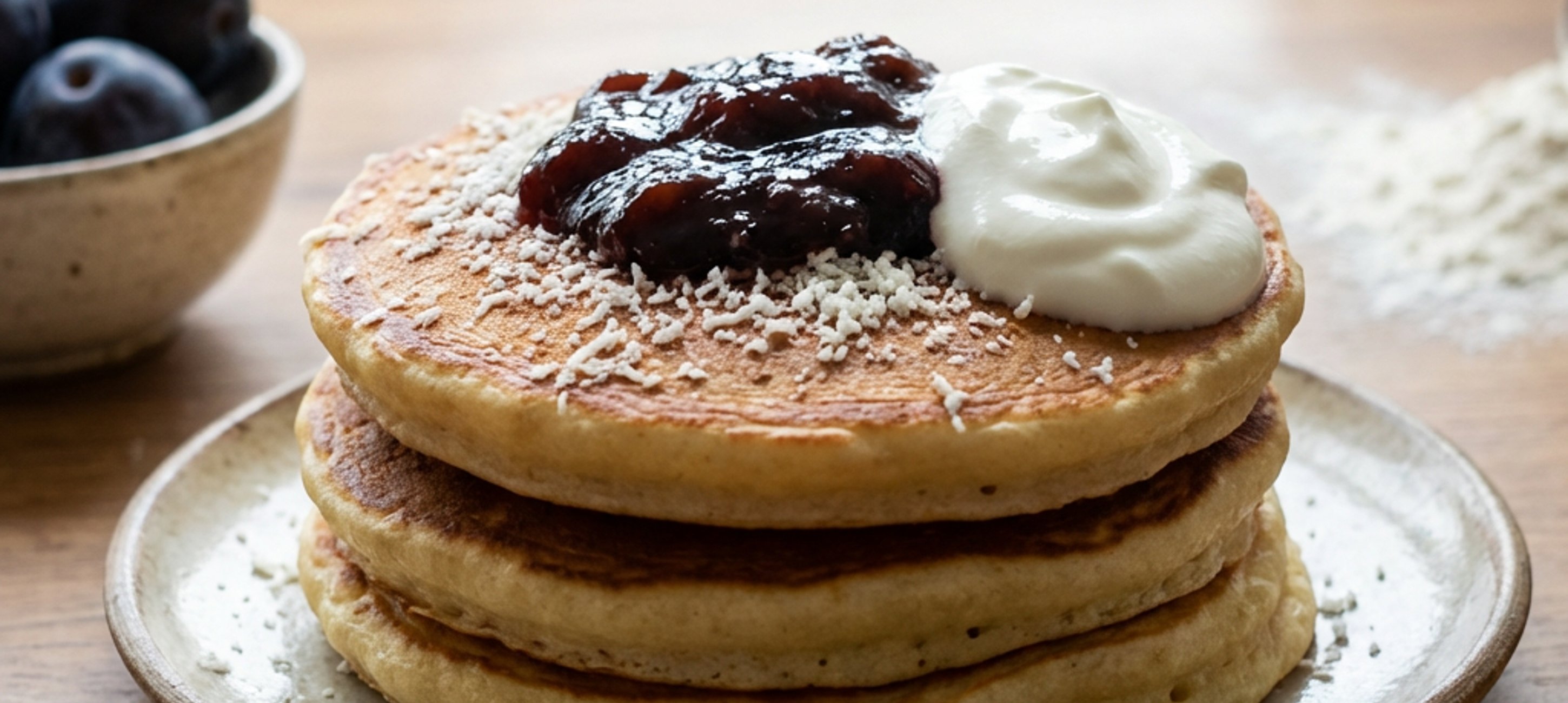 - 5Die fertigen Pancakes warm halten und mit Zwetschkenröster, zerbröseltem Topfen und einem Klecks Sauerrahm servieren. Nach Belieben mit etwas Zucker bestreuen.