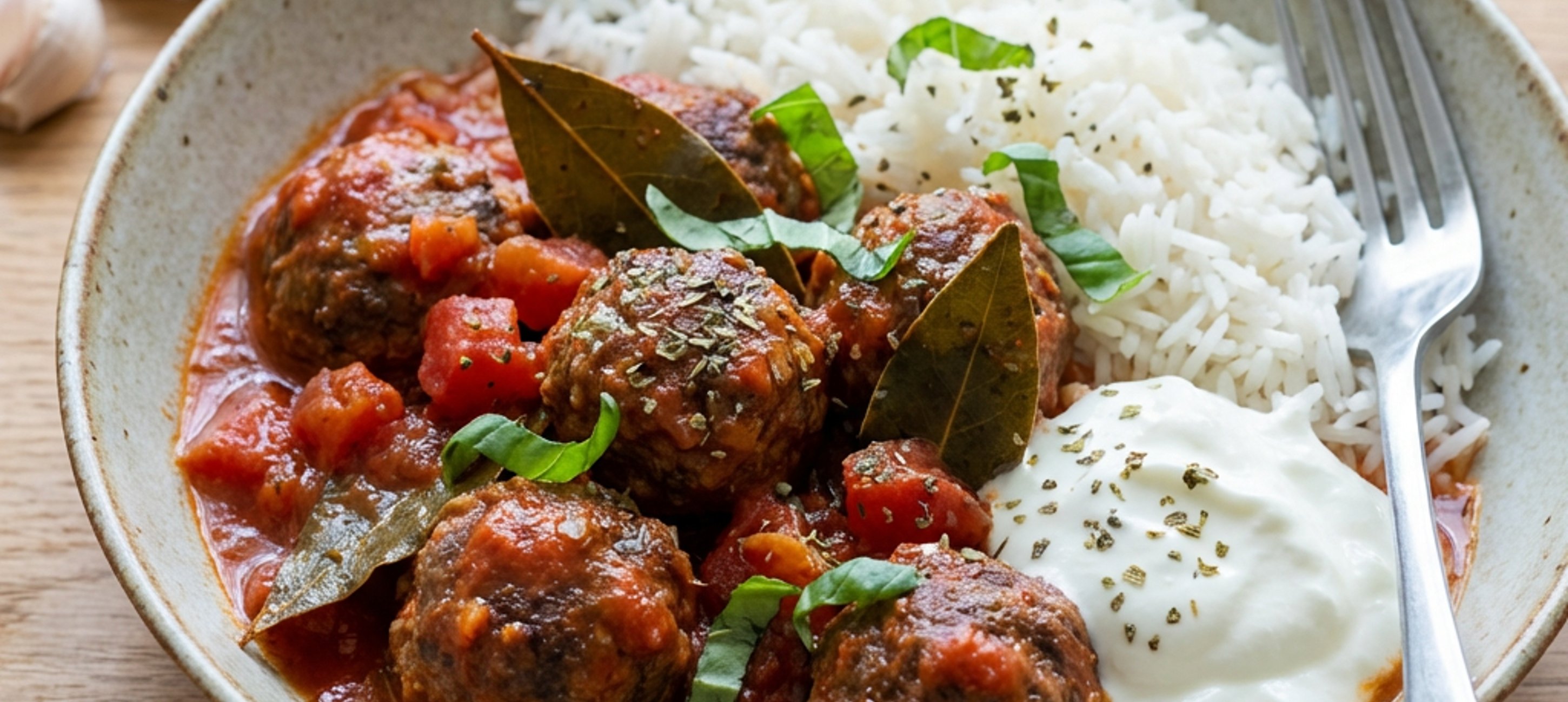 - 4Die fertigen Fleischbällchen mit dem Reis und einem Klecks griechischem Joghurt anrichten. Nach Belieben mit grob gehacktem frischem Basilikum oder Oregano bestreuen und servieren.