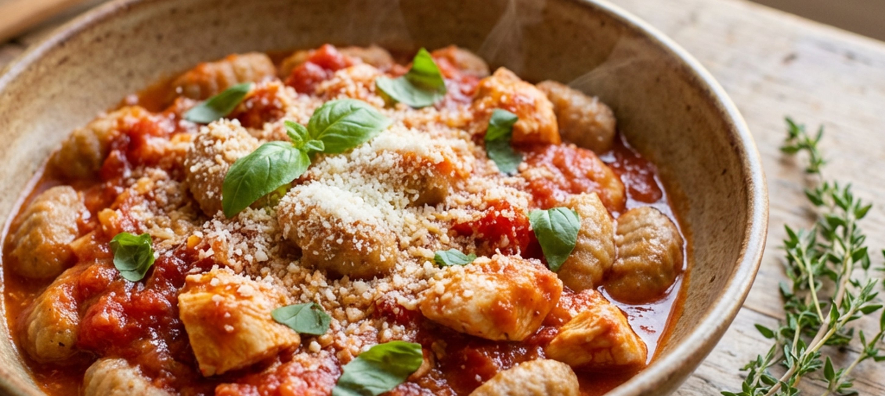 - 3Die Paradeisersauce ca. 15 Minuten bei starker Hitze einkochen lassen. Dann die Hitze auf mittlere Stufe reduzieren, das Hendlfleisch und den Rohrzucker hinzufügen und weitere 5 Minuten köcheln lassen. Anschließend die Gnocchi, den Parmesan sowie Salz und Pfeffer dazugeben. Alles 8–10 Minuten (oder nach Packungsanweisung) unter gelegentlichem Rühren garen, damit die Gnocchi nicht am Pfannenboden anhaften.