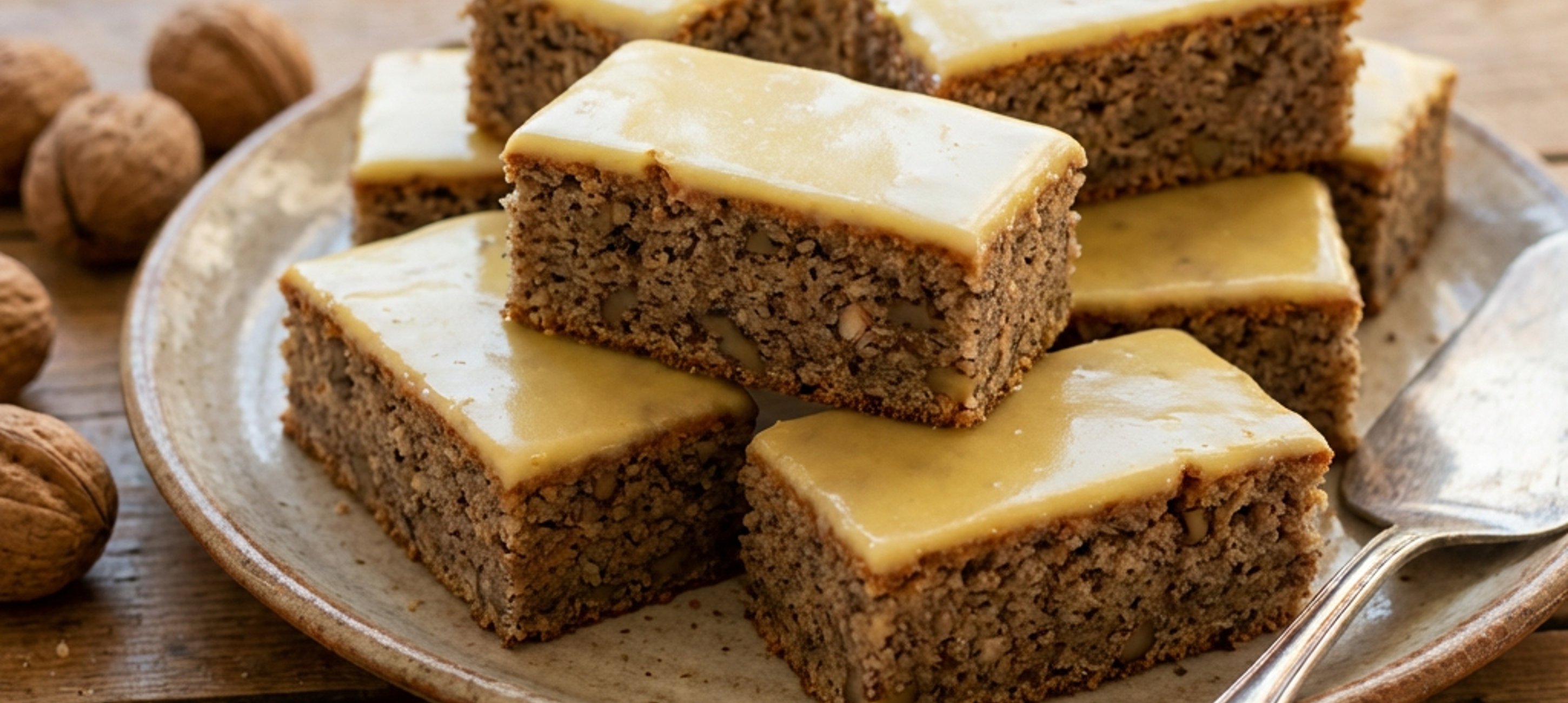 - 4Das Blech aus dem Ofen nehmen und den noch warmen Kuchen sofort mit der Dotterglasur bestreichen. Vollständig auskühlen lassen und am besten erst am nächsten Tag in ca. 5×3 cm große Schnitten schneiden.