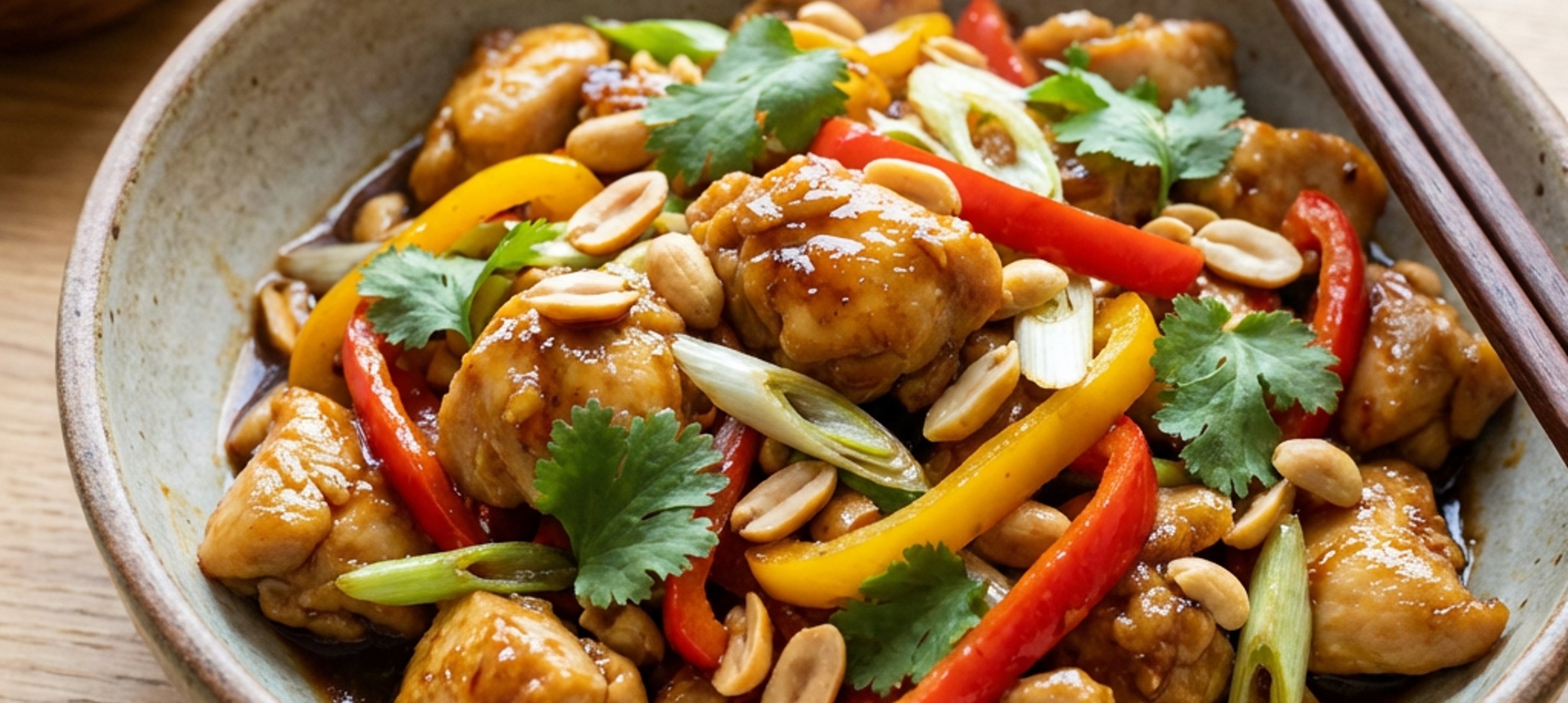 - 4Kung Pao am besten mit Reis servieren. Zusätzlich zu den Erdnüssen können einzelne Portionen auch mit frischem Koriander und extra Frühlingszwiebeln garniert werden.