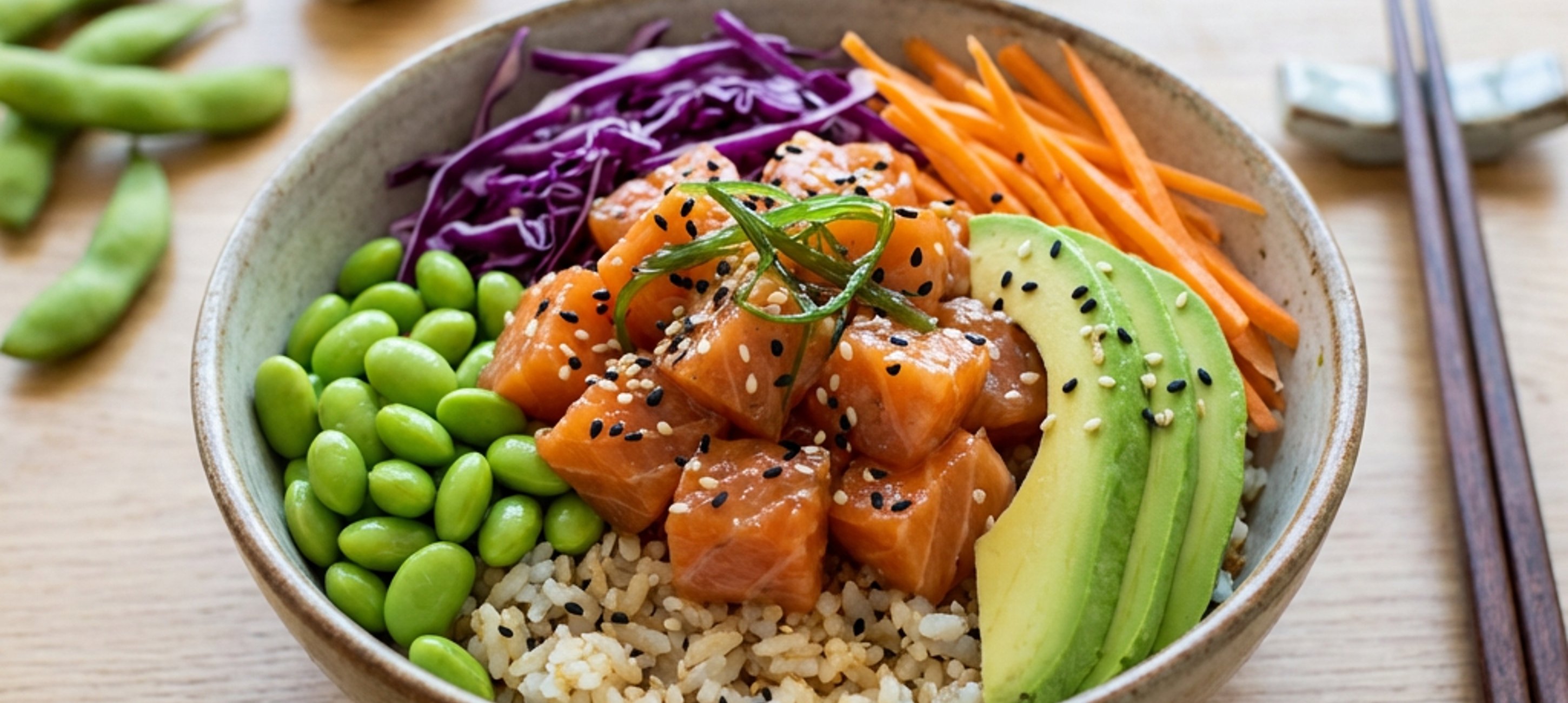 - 6Den Reis in eine Schüssel geben. Die restlichen Zutaten rundherum darauf anrichten, den marinierten Lachs in die Mitte setzen und alles mit Sesam bestreuen.