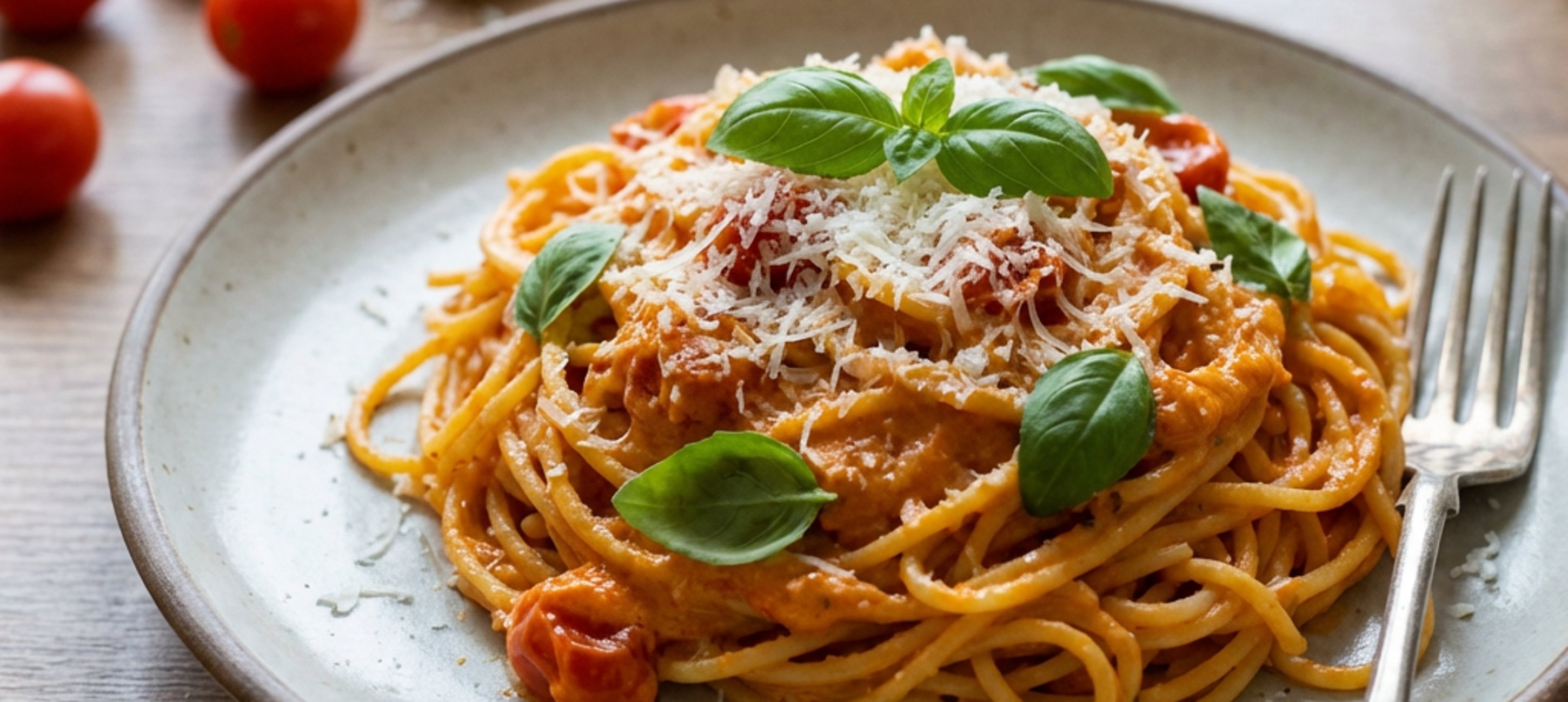 - 4Alles zusammen mit den getrockneten Tomaten, Basilikum und Ricotta zu einer cremigen Sauce pürieren. Spaghetti mit der Sauce vermengen, bei Bedarf etwas Nudelwasser hinzufügen. Auf Teller geben, mit Parmesan und frischem Basilikum servieren – und genießen!