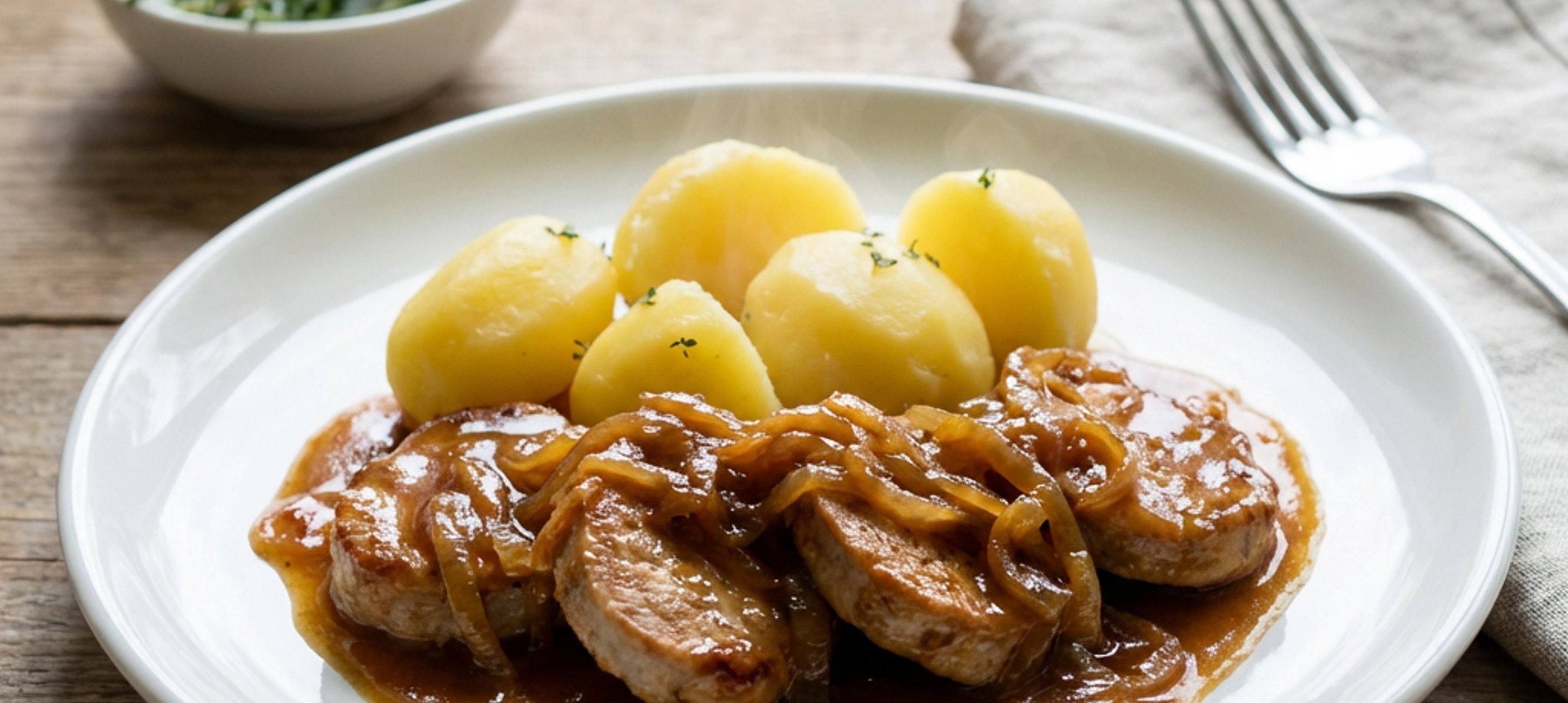 - 10Die Schweinsmedaillons mit der Zwiebelsauce auf Tellern anrichten und servieren.