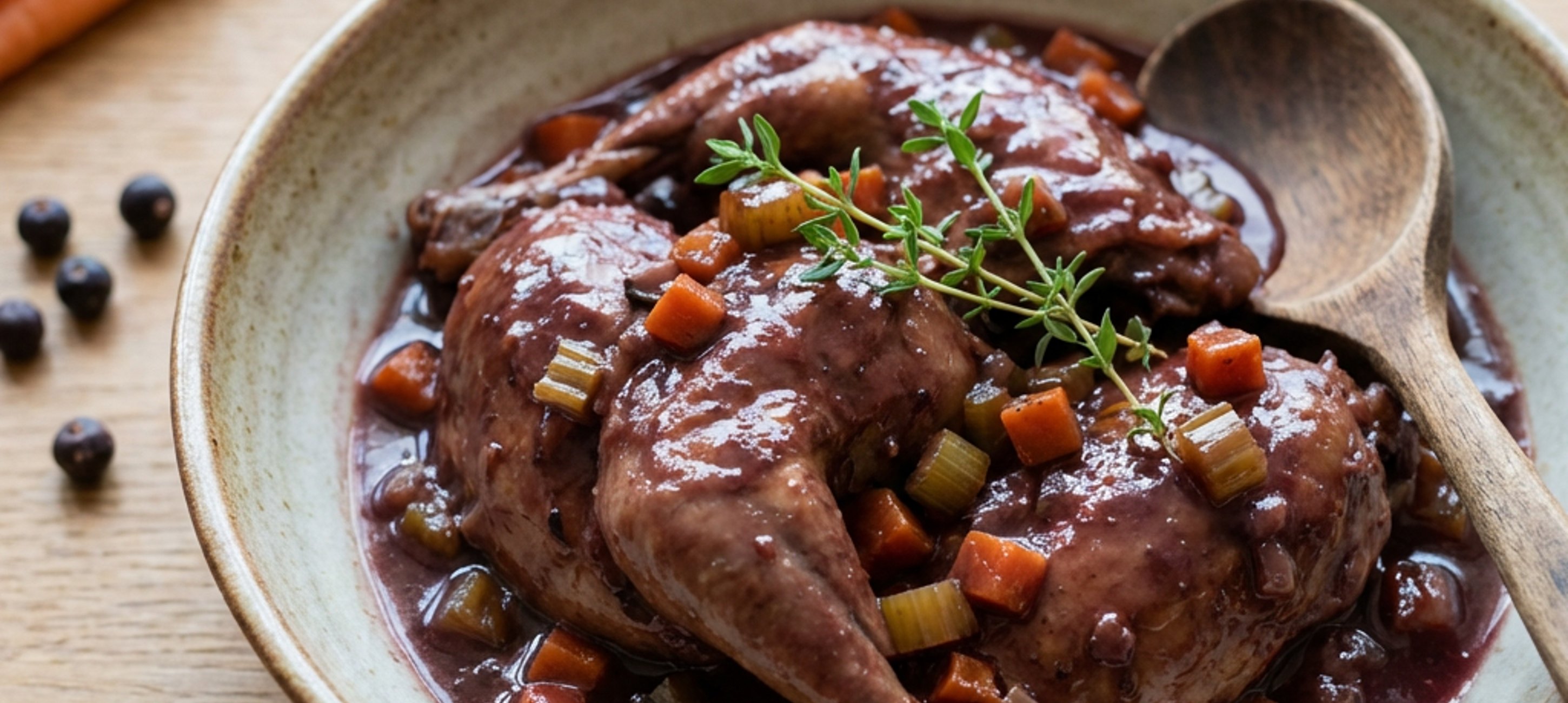 - 5Die Fasanenteile zurück in den Bräter geben, mit Rotwein aufgießen und aufkochen lassen. Die Hitze reduzieren und die Sauce offen einkochen lassen, bis sie etwa ein Drittel ihres Volumens verloren hat.