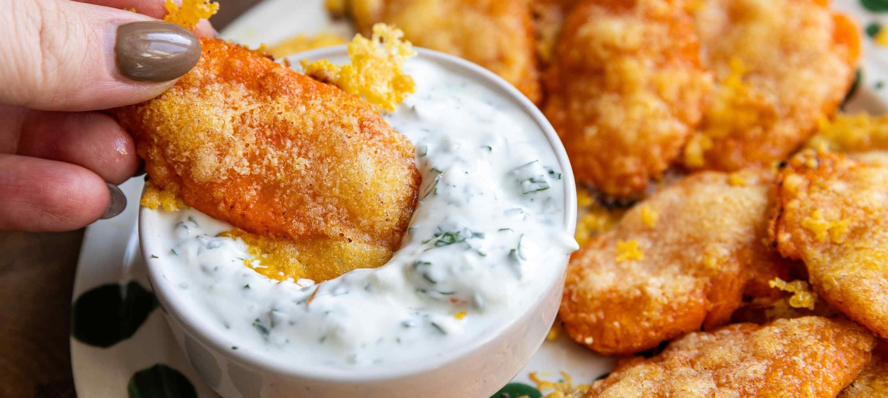 - 6Währenddessen den Dip zubereiten: Das Joghurt mit dem gepressten Knoblauch, der fein gehackten Petersilie und einer Prise Salz glatt rühren.