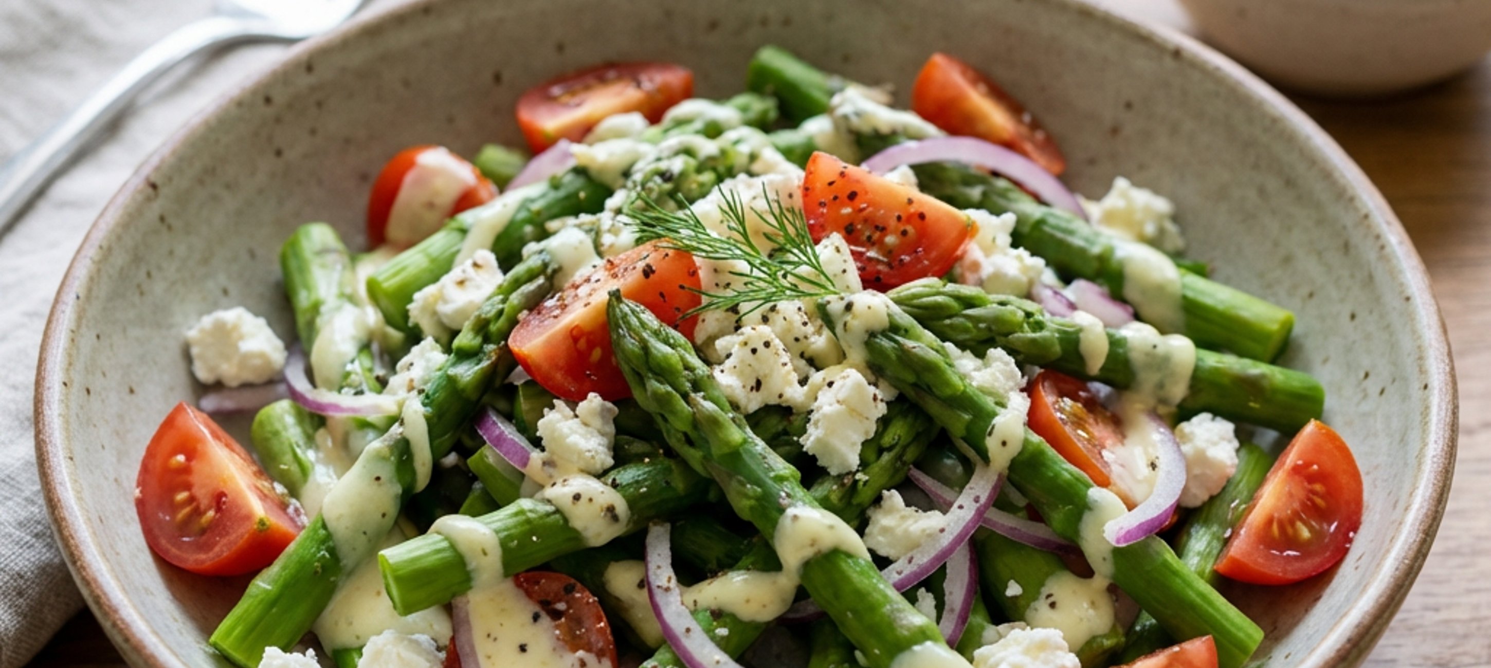 - 2Tomaten vierteln. Zwiebel klein hacken, Feta zerbröseln. Alles mit dem Spargel in eine Schüssel geben.