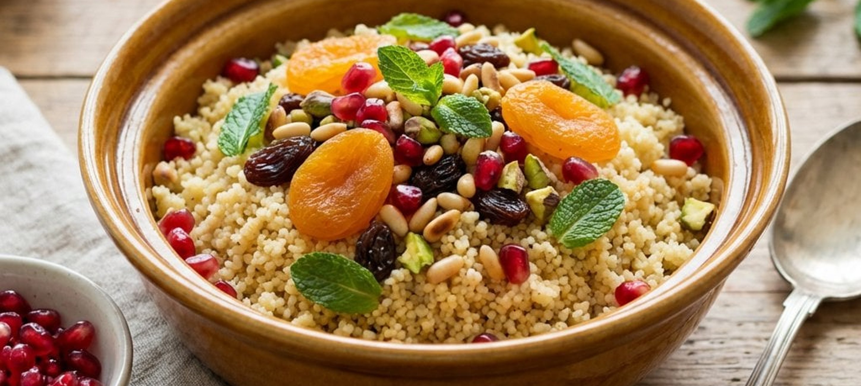 - 5Den Granatapfel halbieren und die Kerne vorsichtig herausklopfen. Die getrockneten Marillen fein würfeln, die Pistazien grob hacken. Pinienkerne, Pistazien, Mandelblättchen, Trockenfrüchte, Kokosraspel, gehackte Kräuter, Granatapfelkerne sowie Zitronenschale und -saft unter den Couscous mischen. Das restliche Olivenöl unterrühren, mit Salz und Pfeffer abschmecken und servieren.
