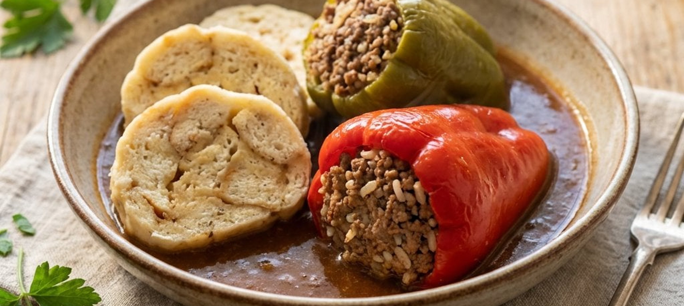- 4Die Sauce sollte auf ca. 400 ml eingekocht sein. Falls nötig, kurz bei starker Hitze weiter reduzieren oder mit etwas Wasser strecken. Die Sauce durch ein feines Sieb in einen sauberen Topf passieren und nach Geschmack mit Salz und Pfeffer abschmecken. Die Paprika mit der Sauce und Beilagen nach Wahl (Reis oder Semmelknödel) servieren.