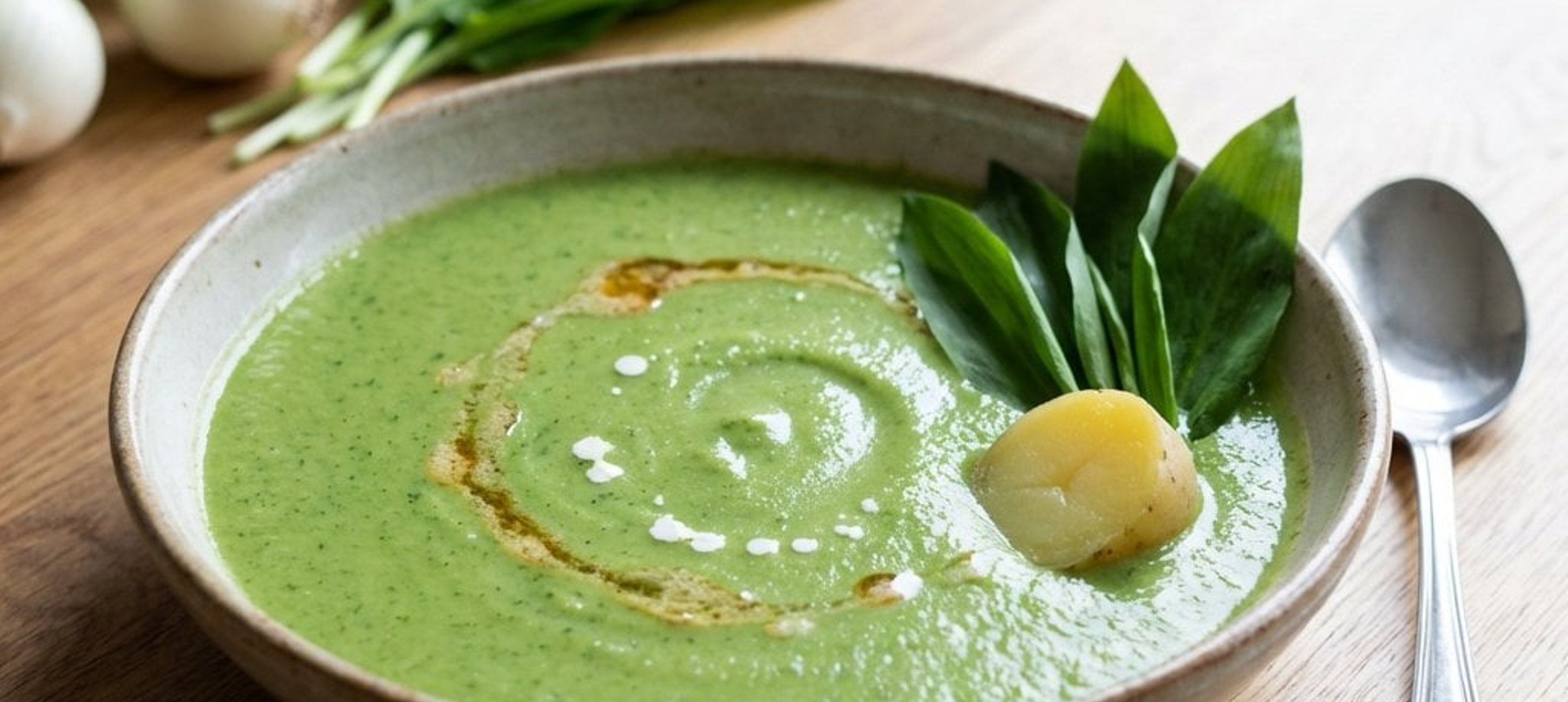 - 2Den frischen Bärlauch, Schlagobers, die Erdäpfelstücke, eine Prise Muskatnuss und etwa 1 TL Salz hinzufügen. Die Suppe kurz aufkochen und für ca. 1 Minute köcheln lassen. Die heiße Suppe mit einem Stabmixer fein pürieren und nach Belieben durch ein feines Sieb streichen. Mit Salz abschmecken.