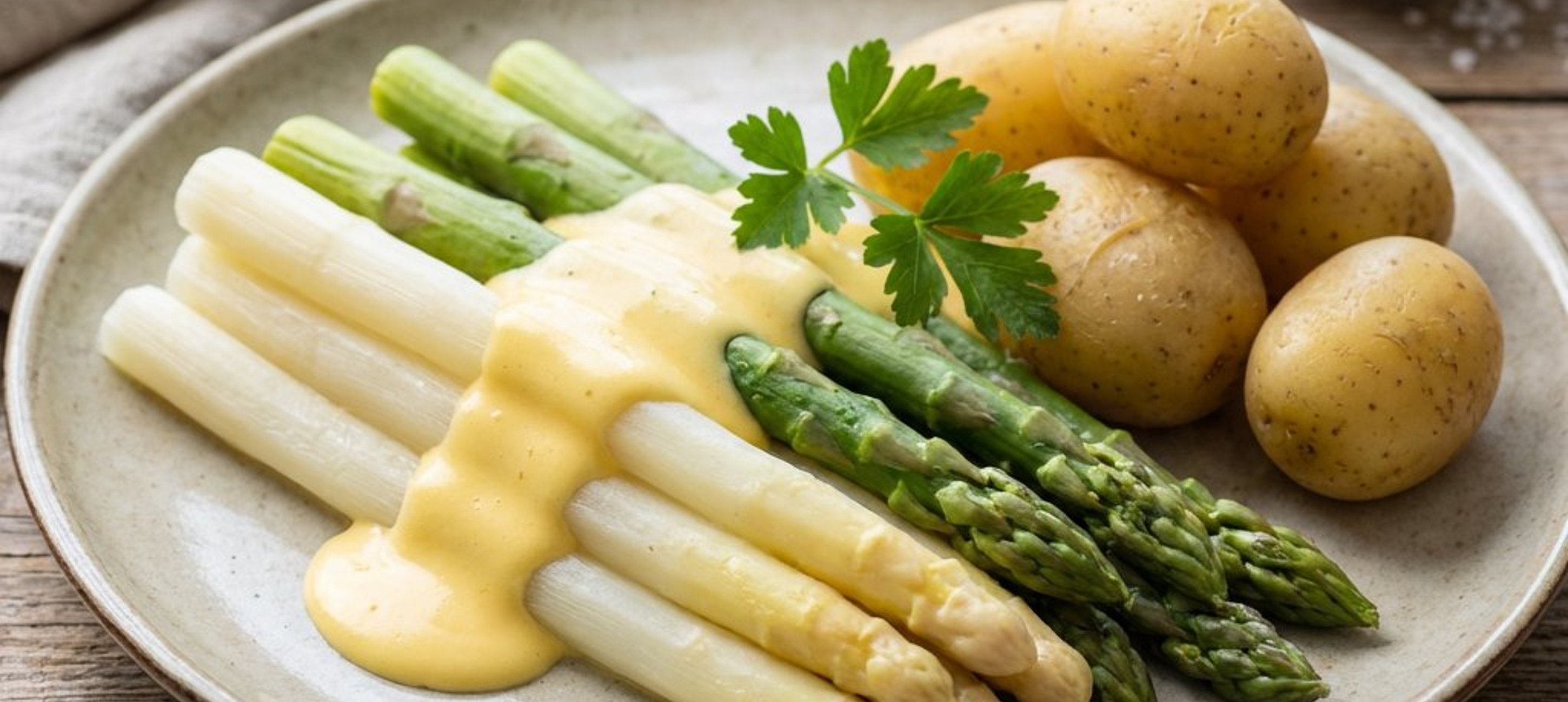 Ein kleiner Schuss Weißwein in der Reduktion verleiht der Hollandaise eine besonders edle Note. Achten Sie darauf, dass das Wasser im Wasserbad nicht kocht, damit die Sauce schön cremig bleibt und nicht gerinnt. Servieren Sie den Spargel am besten auf vor