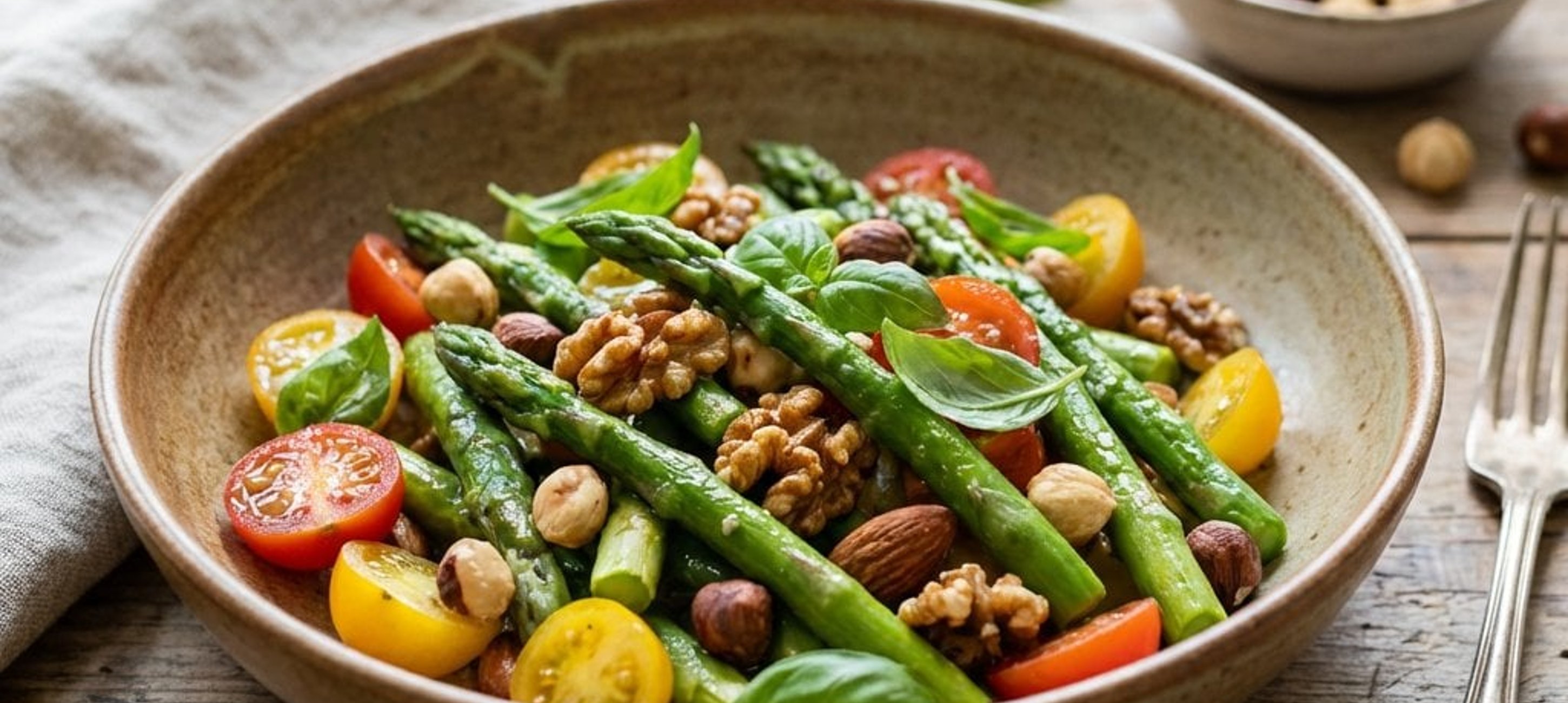 - 7Die gerösteten Nüsse und Mandeln in einer Schüssel mit Rosinen, Cranberries, Olivenöl, Zitronensaft und Honig vermengen. Die geschnittenen Paradeiser und den Spargel hinzufügen. Mit einer Prise Salz abschmecken und vorsichtig vermischen.