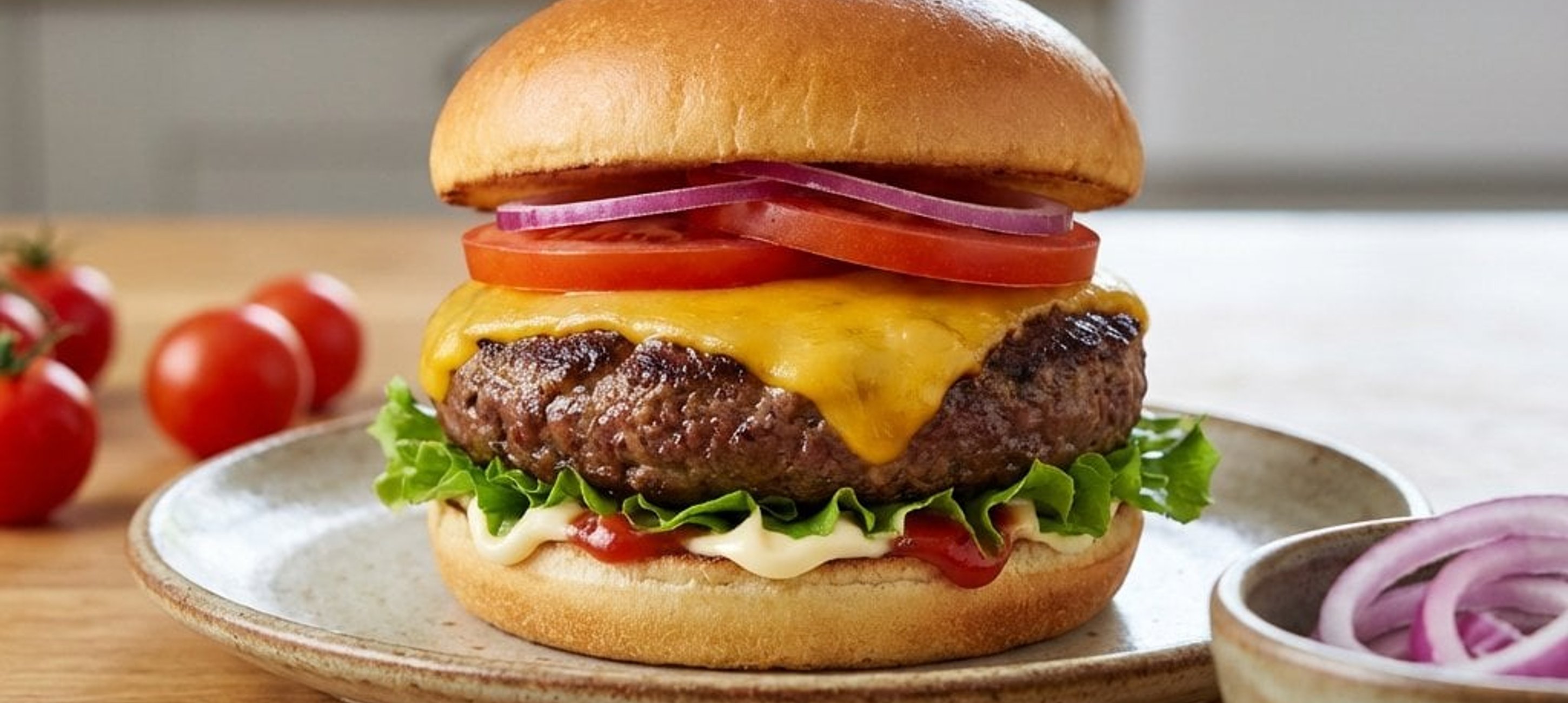 Wusstest du, dass das Patty in der Mitte flach gedrückt werden sollte? So bleibt es beim Braten schön eben und wölbt sich nicht auf! Ein kleiner Trick für den perfekten Burger-Genuss.