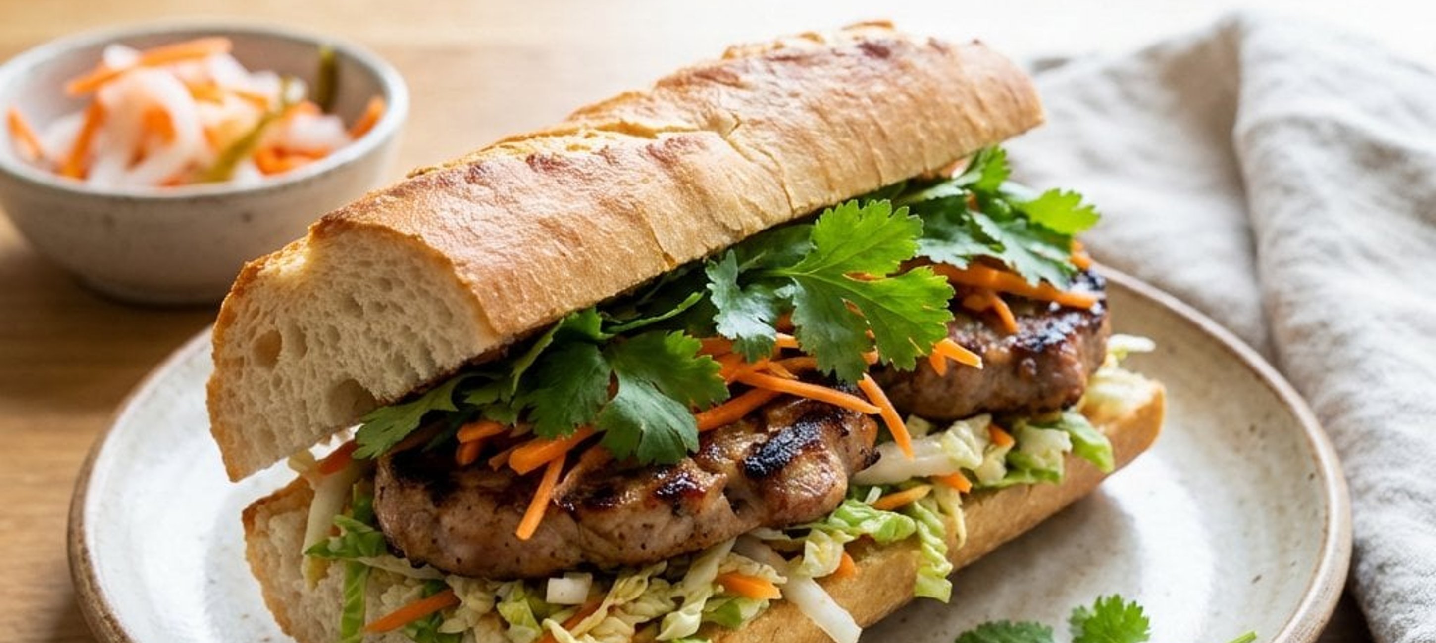 - 1Die Baguettes längs aufschneiden und auf der Schnittfläche kurz anrösten. Auf die Unterseite etwas Salat geben, das Fleisch darauf platzieren, mit frischem Koriander bestreuen und die Oberseite des Baguettes aufsetzen.