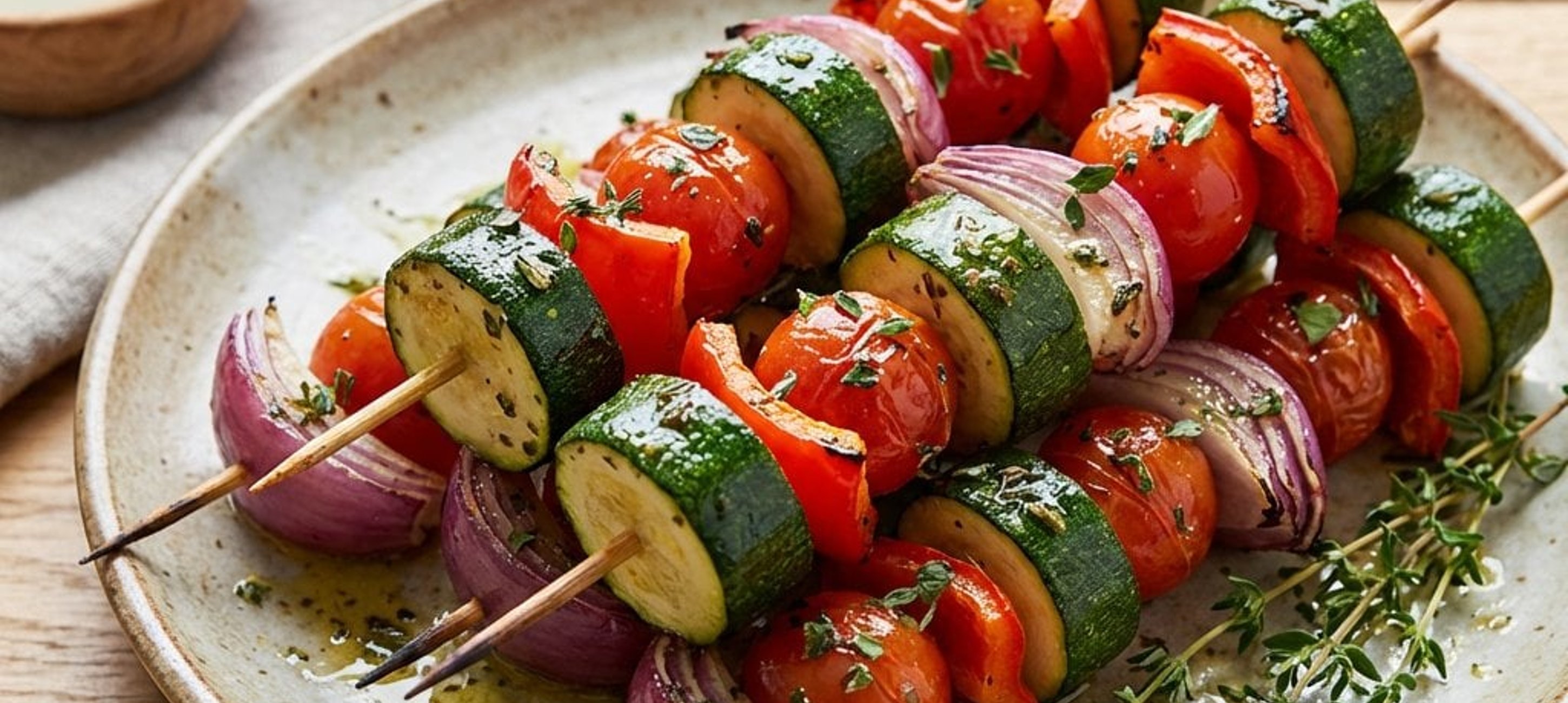 Für noch mehr Abwechslung können Sie auch Champignons, Maiskolbenstücke oder Halloumi-Würfel auf die Spieße stecken.