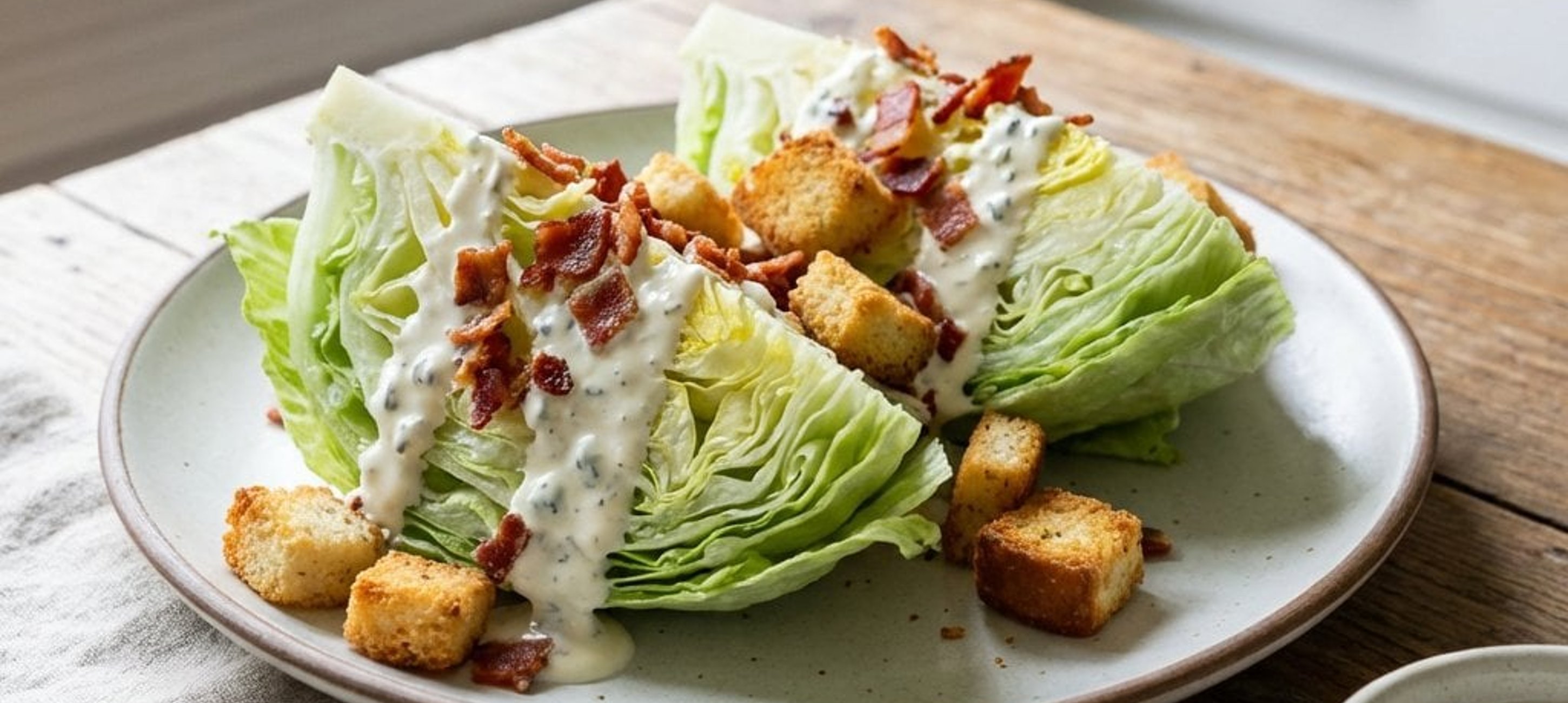 - 7Den Eisbergsalat putzen, den Strunk herausschneiden und den Salat in Achtel schneiden. Jeweils zwei Salatspalten auf einem Teller anrichten, großzügig mit dem Dressing übergießen und mit den knusprigen Croutons sowie dem Speck bestreuen.