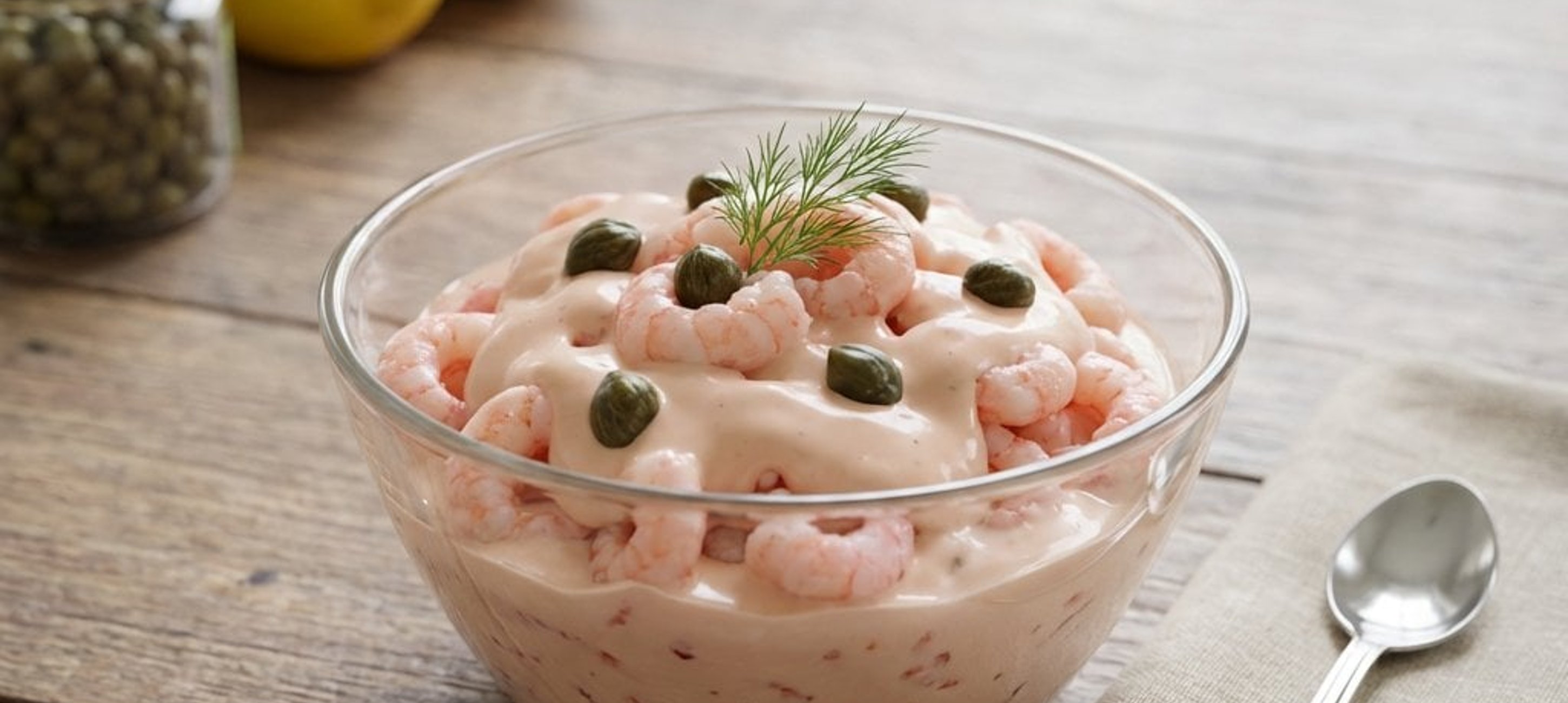 - 2Die gekochten Cocktailgarnelen und die Kapern vorsichtig unter die Sauce heben.