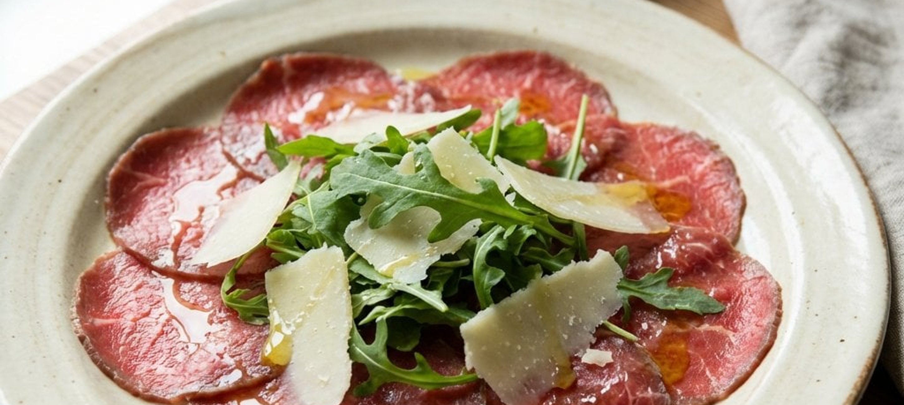 Servieren Sie das Carpaccio sofort nach der Zubereitung, damit das Fleisch seine zarte Textur behält. Ein Glas trockener Rotwein passt hervorragend dazu.
