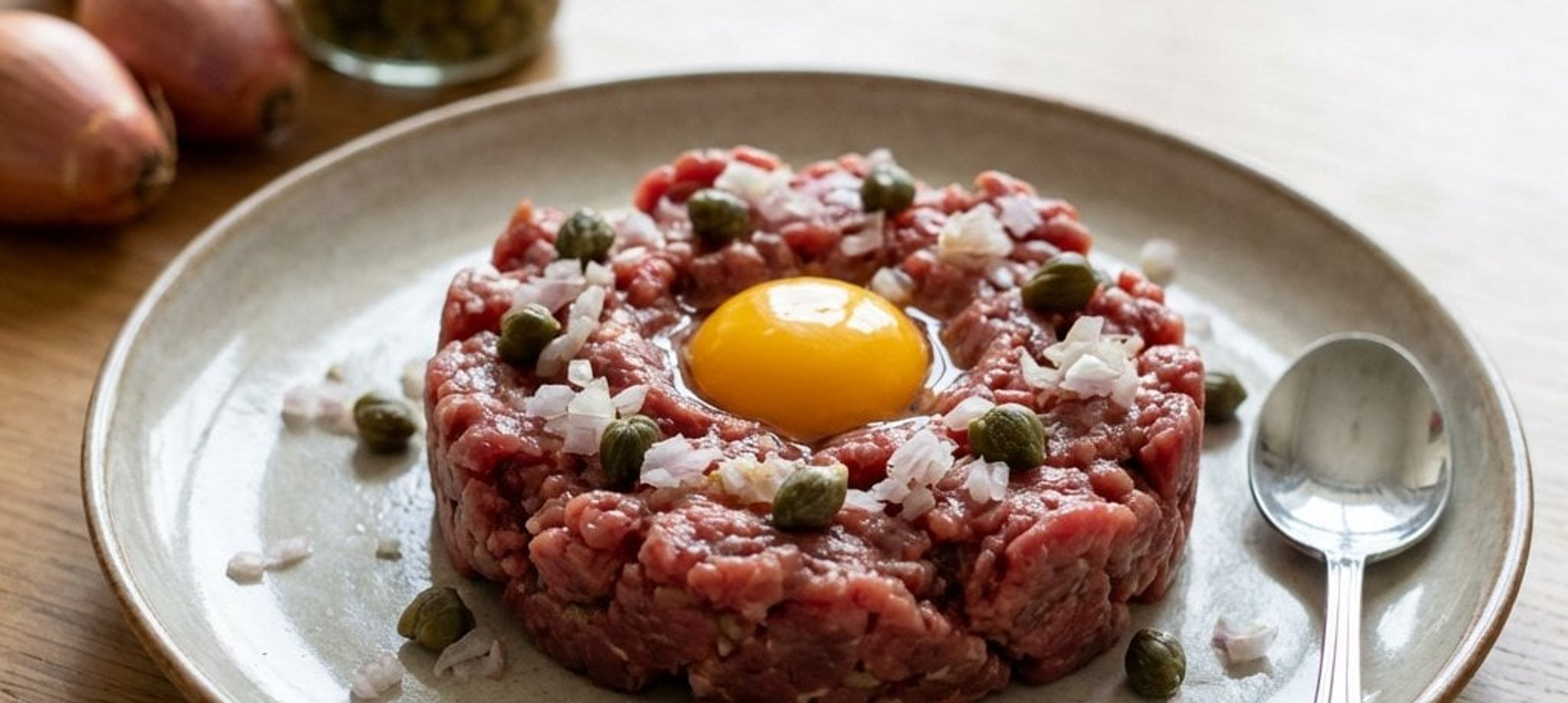 - 4Den frischen Eidotter vorsichtig in die Vertiefung setzen. Das Beef Tartar sofort servieren, damit jeder den Dotter nach Belieben selbst unter das Fleisch mischen kann. Dazu passt klassisch getoastetes Schwarzbrot oder Baguette mit Butter.