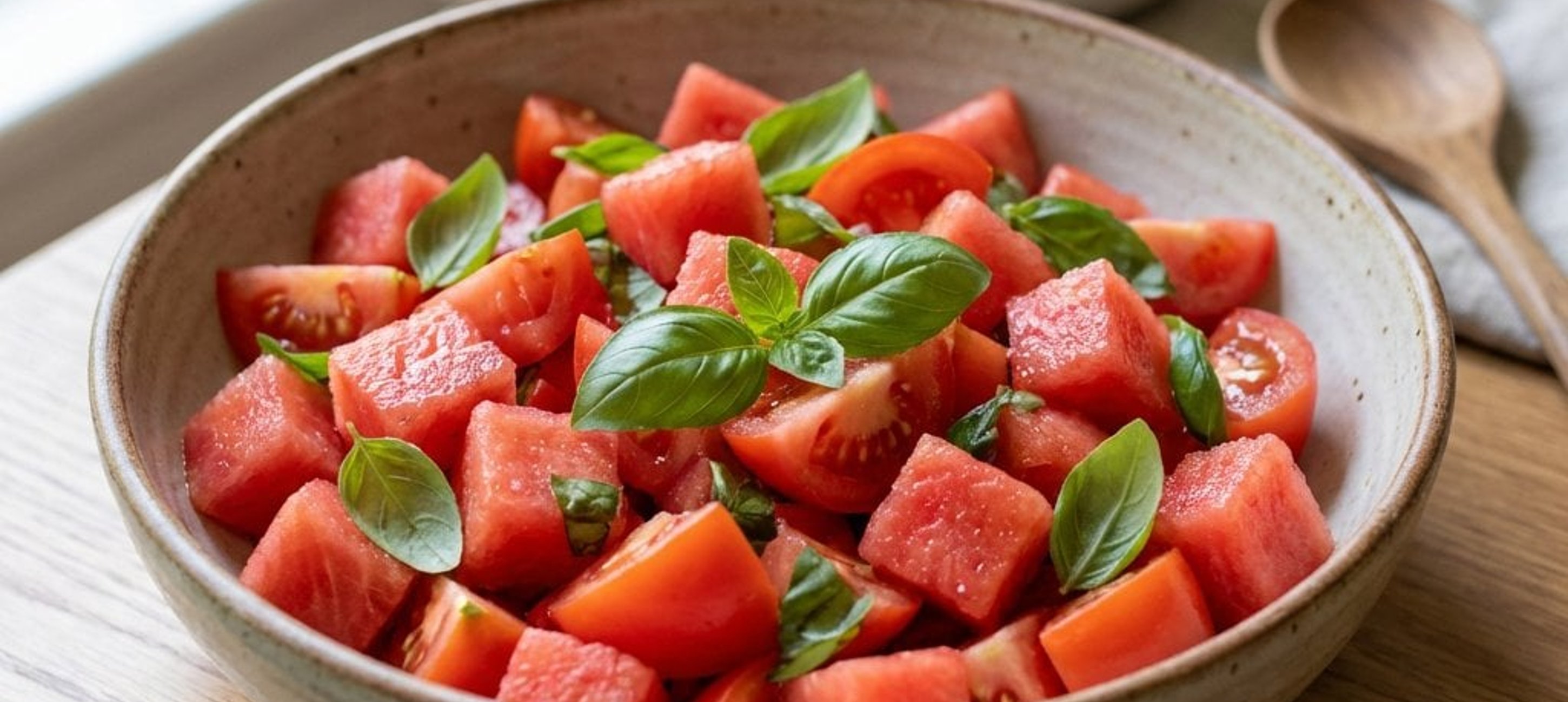 Der Salat schmeckt am besten, wenn die Wassermelone direkt aus dem Kühlschrank kommt. So bleibt er besonders knackig und erfrischend.