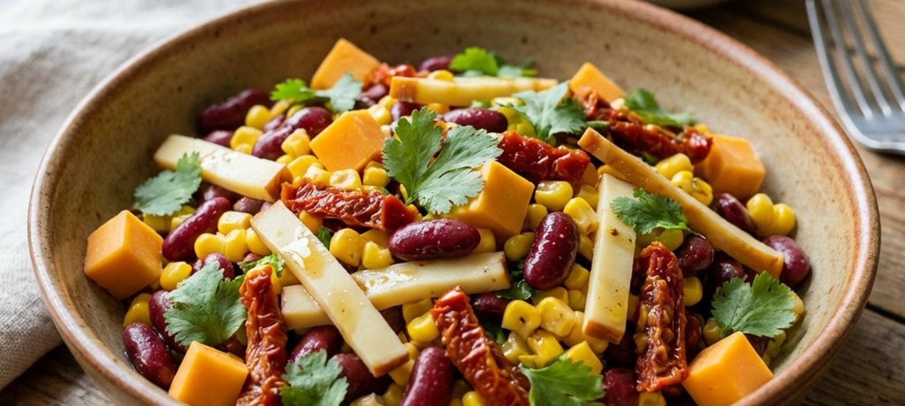 - 3In einer zweiten Schüssel die Cheddarwürfel, die gehackten Tomaten, die abgetropften Kidneybohnen, den Mais, den fein gehackten Koriander und den frisch geriebenen Ingwer vermischen.