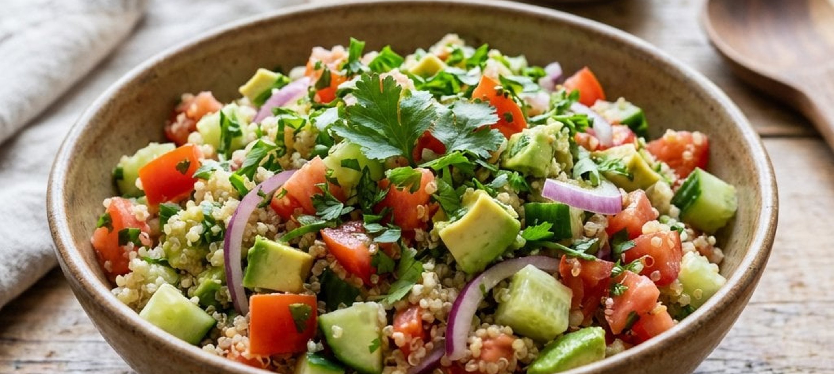 - 3In der Schüssel mit dem abgekühlten Quinoa die Paradeiser, Gurkenwürfel und die rote Zwiebel vermengen. Das Olivenöl, den frisch gepressten Zitronensaft und den Rotweinessig hinzufügen und alles vorsichtig unterheben. Zum Schluss die Avocadowürfel, den gehackten Knoblauch und die Kräuter dazugeben. Den Salat mit Salz und Pfeffer abschmecken und vor dem Servieren kurz ziehen lassen.