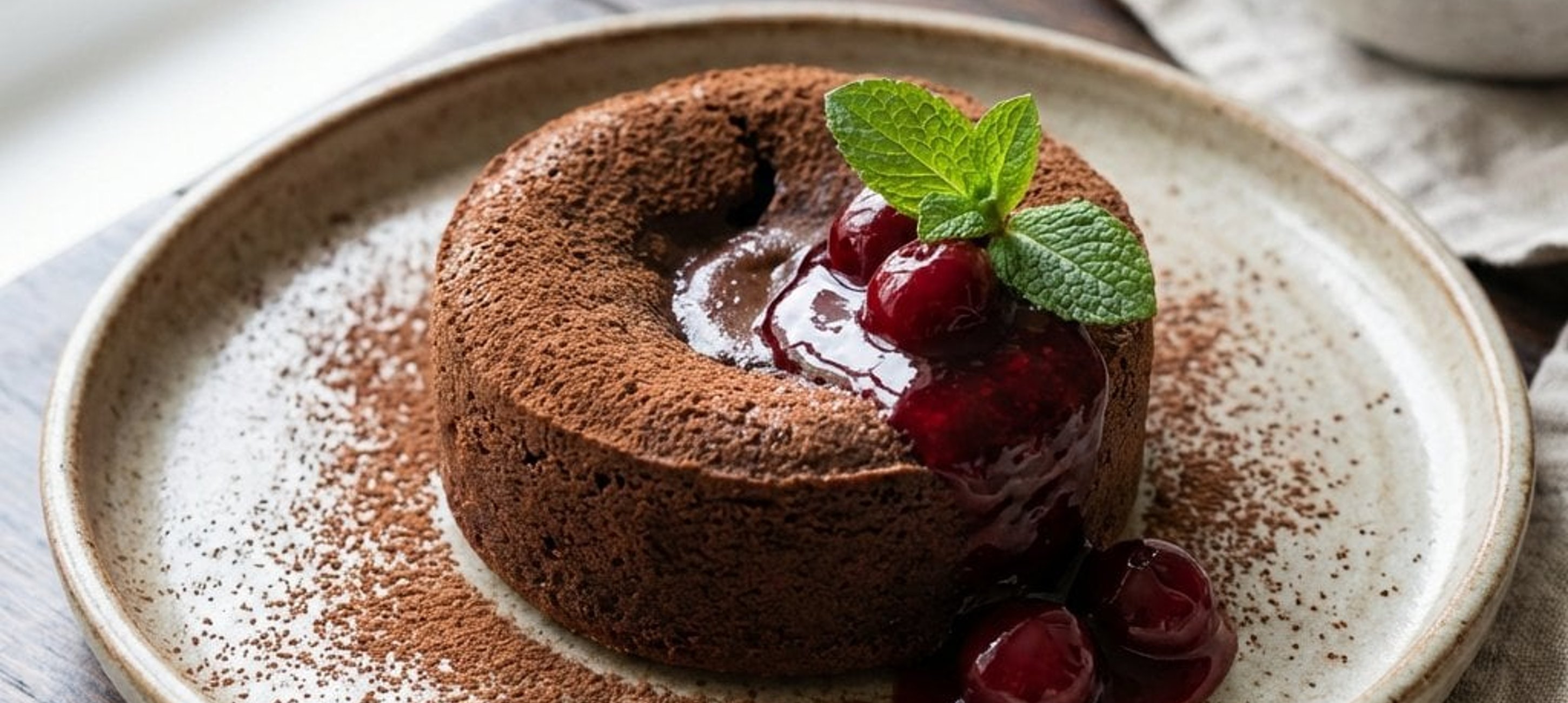 - 6Mit der warmen Weichselsauce anrichten, leicht mit Staubzucker bestäuben und mit frischer Minze garnieren. Sofort servieren.