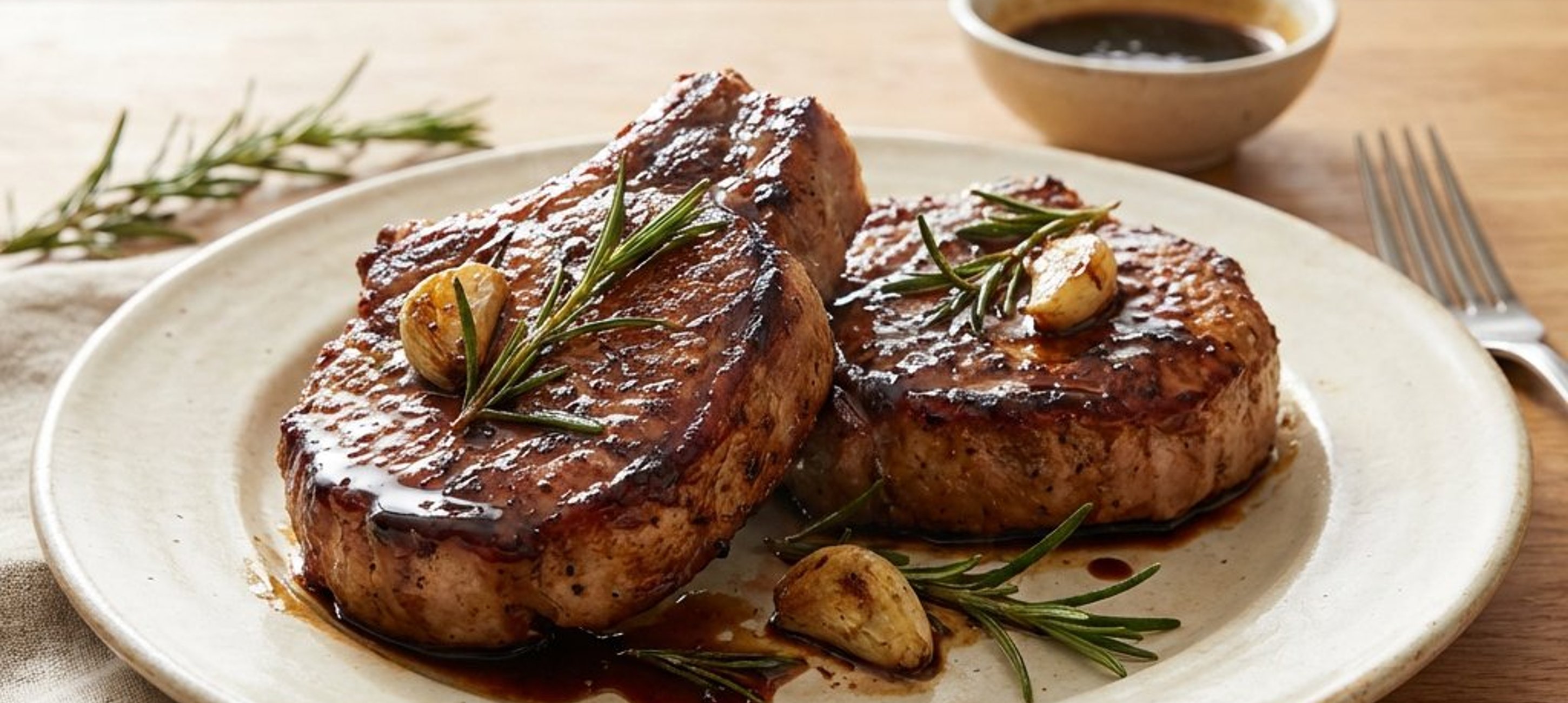 - 1Den Backofen auf 180 °C Ober-/Unterhitze vorheizen. Die Schweinskoteletts von beiden Seiten gründlich mit Salz und Pfeffer würzen.