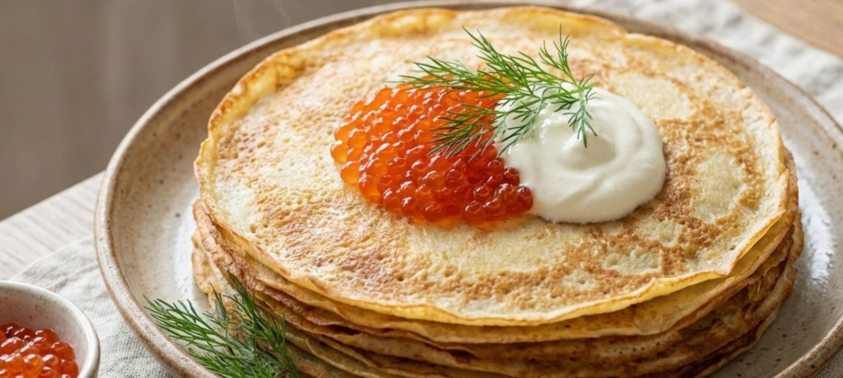 - 3Die noch warmen Bliny mit einem Klecks Sauerrahm, etwas Kaviar, frischem Dill und abgeriebener Zitronenschale garnieren. Mit einer weiteren Prise frisch gemahlenem Pfeffer und einem Spritzer Zitronensaft vollenden.