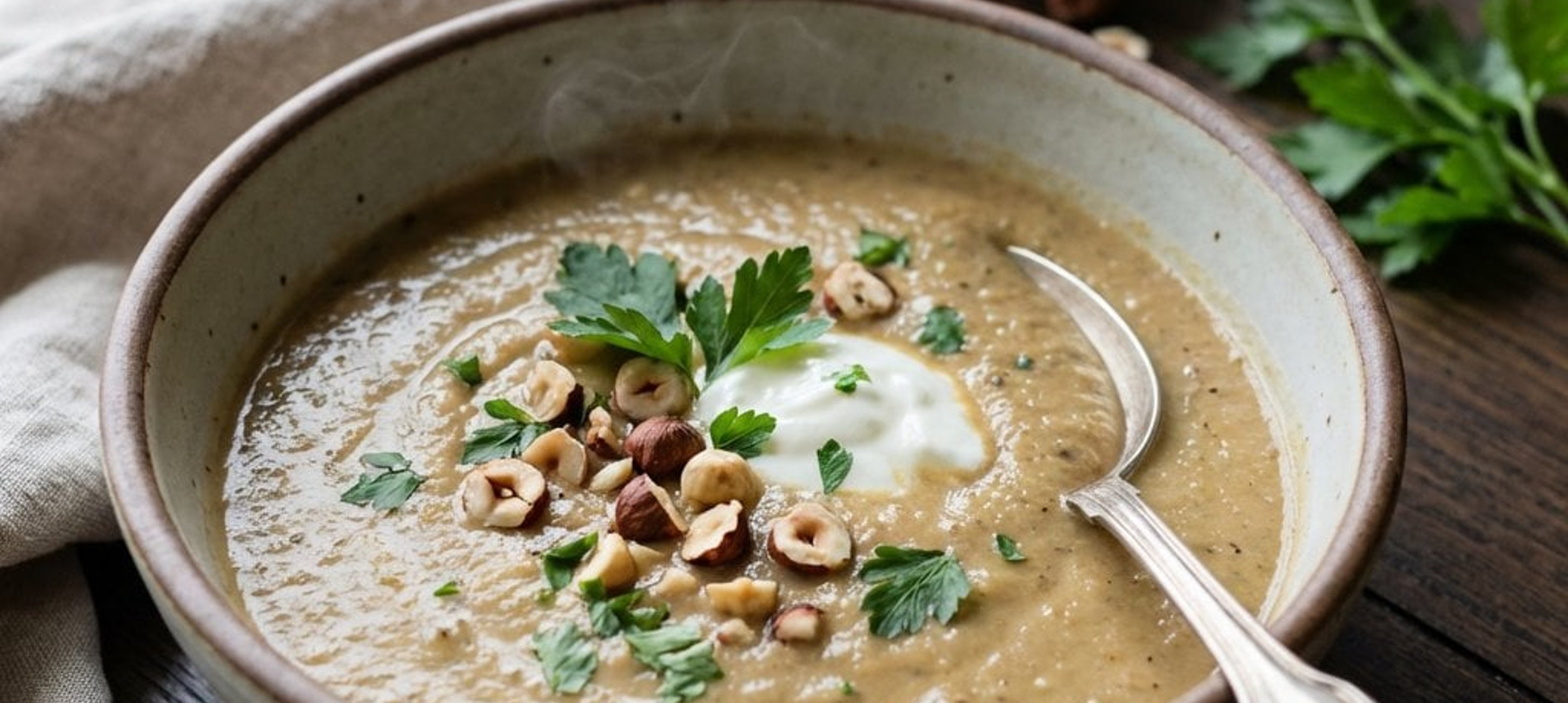 - 1Die Suppe in Tellern anrichten, mit etwas Olivenöl beträufeln, mit gehackter Petersilie und Haselnüssen bestreuen und mit einem Klecks griechischem Joghurt garnieren.