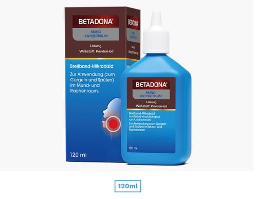 In case of infectious-inflammatory diseases and injuries in the mouth and throat Betadona Mouth Antiseptic is used diluted (1 part Mouth Antiseptic, 8 to 16 parts lukewarm water = about 2 to 4 capfuls to about 1/8 litre glass of water). Rinse the mouth and/or gargle for at least 30 seconds every 1 - 4 hours until the disease subsides.
