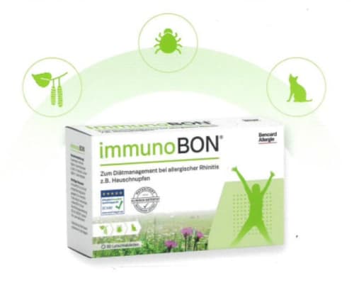 ImmunoBON® for allergic rhinitis immunoBON® was developed by one of Austria's leading immunologists Univ. Prof. Dr. Erika Jensen-Jarolim and, due to its composition and properties, meets the specific nutritional needs of allergy sufferers, strengthens their immune system and supports the relief of allergic symptoms.1In untreated raw milk as well as in the ambient air of farms with traditional cattle husbandry, special whey proteins are present that play an essential role in the allergy process. This whey protein is the basis of immunoBON® and is structured like a bag that is filled with iron, among other things. There is scientific evidence that iron deficiency is associated with the development of allergy. Zinc and vitamin A help to calm and strengthen the immune system. immunoBON® is a food for balanced diets with whey protein, zinc, iron and vitamin A and can meet the specific nutritional needs of allergy sufferers. Scientific data shows that the combination of whey proteins, zinc, iron and vitamin A balances the disturbed immune response in allergic rhinitis. immunoBON® is a lozenge for dietary management of allergic rhinitis, e.g. hay fever. It has a supportive effect on pollen allergy, mite allergy and animal hair allergy and is suitable for adults and children from 3 years of age. The manufacturer is Bencard Allergie GmbH, pharmacy distribution in Austria is handled exclusively by Dr. A.&L. Schmidgall GmbH & Co KG. 1 Bergmann K. C. et al, "Impact of a novel immune-modulating dietary supplement on house dust mite-induced allergic rhinoconjunctivitis -first evaluation in an allergen exposure chamber." ePoster number P7.10 -DAK 2020