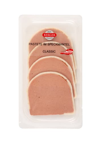 Tender pork liver and juicy pork are coated with a thin layer of bacon according to a traditional production process. Finely seasoned - and exquisite in taste. Finely sliced pâté.