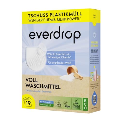 Universal detergent for light and colourfast laundry, suitable for temperatures from 20°C - 60°C. Contents 19 washes. The new everdrop universal detergent for light & colourfast laundry with improved formula! It washes more sustainably and powerfully than ever before - as proven by the EU Ecolabel. Compared to conventional ecological detergents, it can be dosed up to 40% lower with the same performance. With its surfactants based on plant-based raw materials, it washes deep into the fibres from as low as 20°C, helping to save energy. BENEFITS - for brilliantly white laundry - washes deep into the fibres - stronger performance & up to 40% lower dosage* - washing active from 20°C - vegan & without microplastics - skin compatibility "very good" by Dermatest - fragrance: lemon, lavender, cedarwood *compared to conventional ecological detergents IMPACT The ingredients are 100% vegan, free of microplastics and easily biodegradable. The paper packaging consists of at least 95% recycled material and is fully recyclable in waste paper. Like all everdrop products, the universal detergent comes completely without plastic waste!