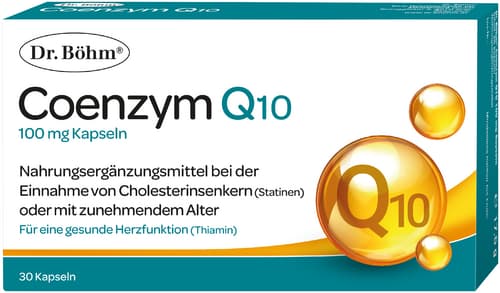 Dr. Böhm® Coenzyme Q10 is your daily companion from 50 onwards and while taking cholesterol-lowering drugs (statins). The capsules combine Coenzyme Q10 in a particularly high dosage (100 mg) with the important Vitamin B12 and Thiamine (Vitamin B1).